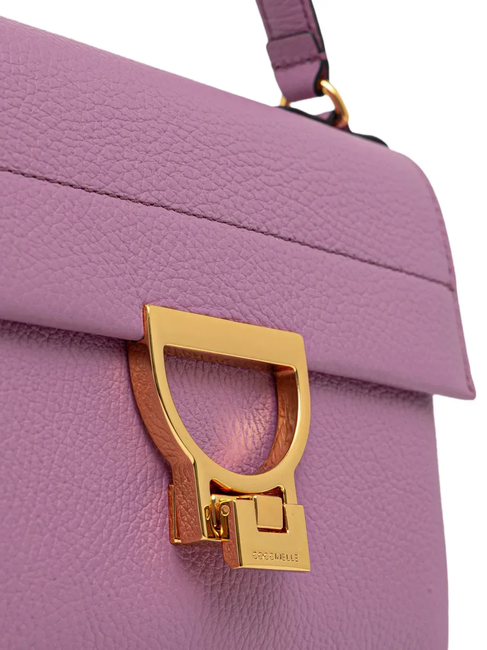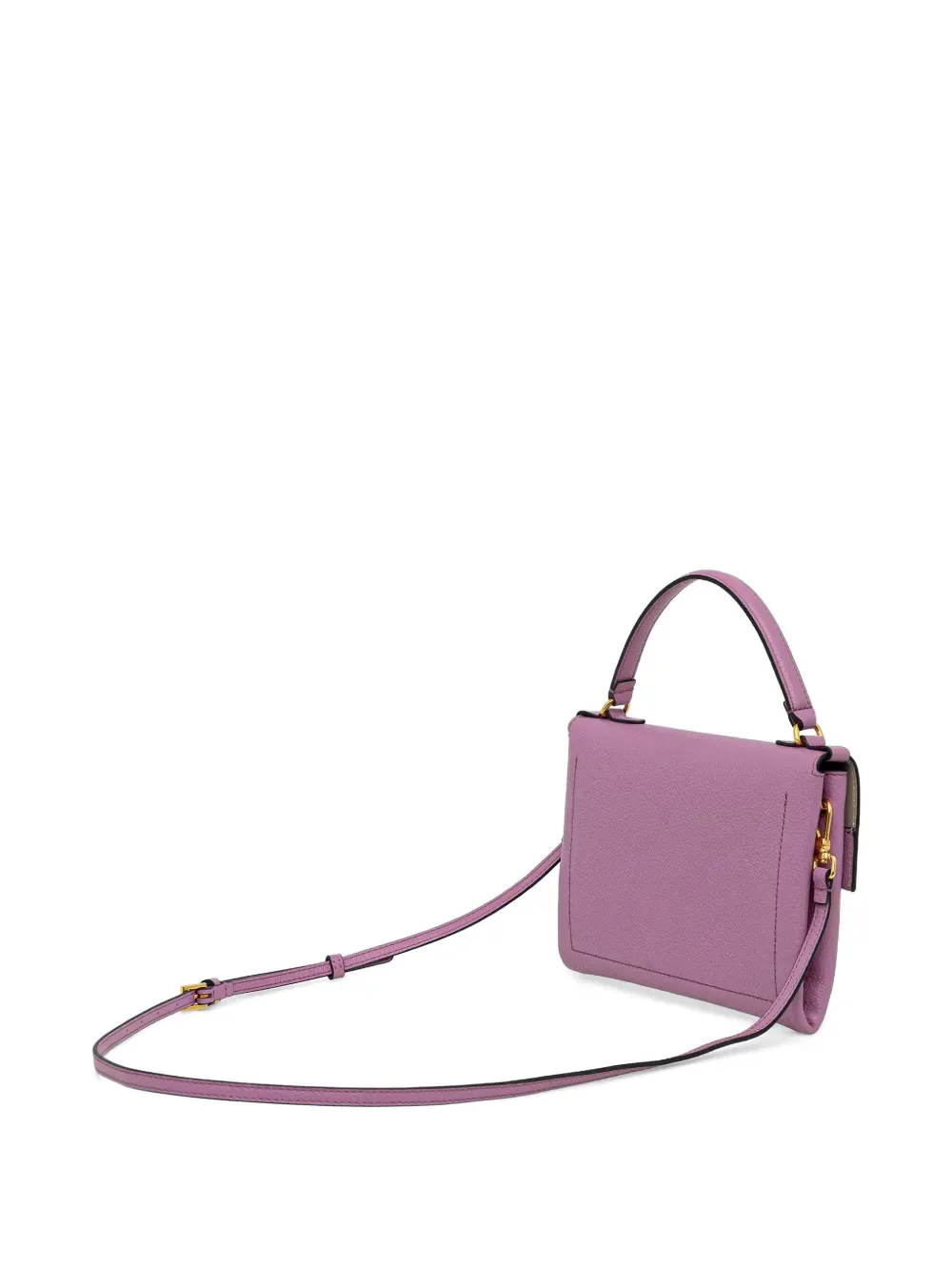 Сиреневая сумка с верхней ручкой, съемным плечевым ремнем, фурнитурой золотистого оттенка и застежкой-защелкой