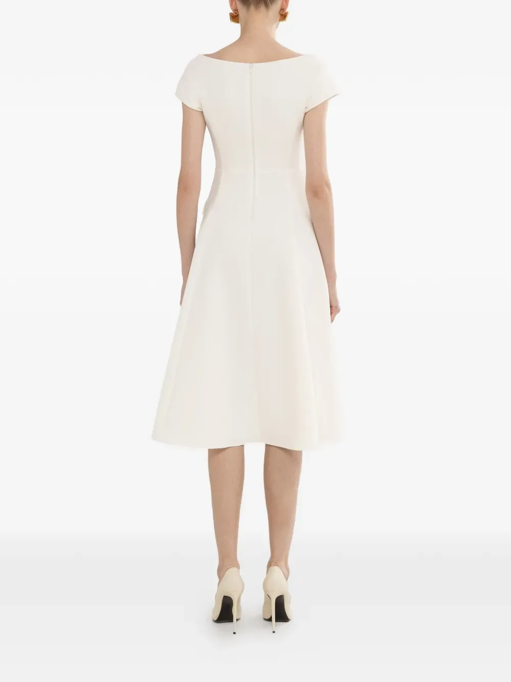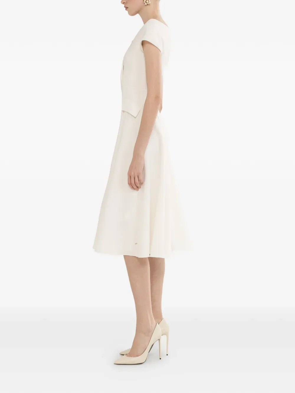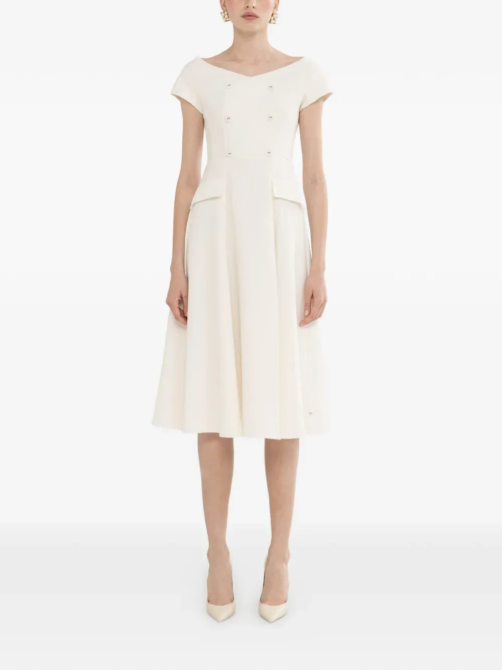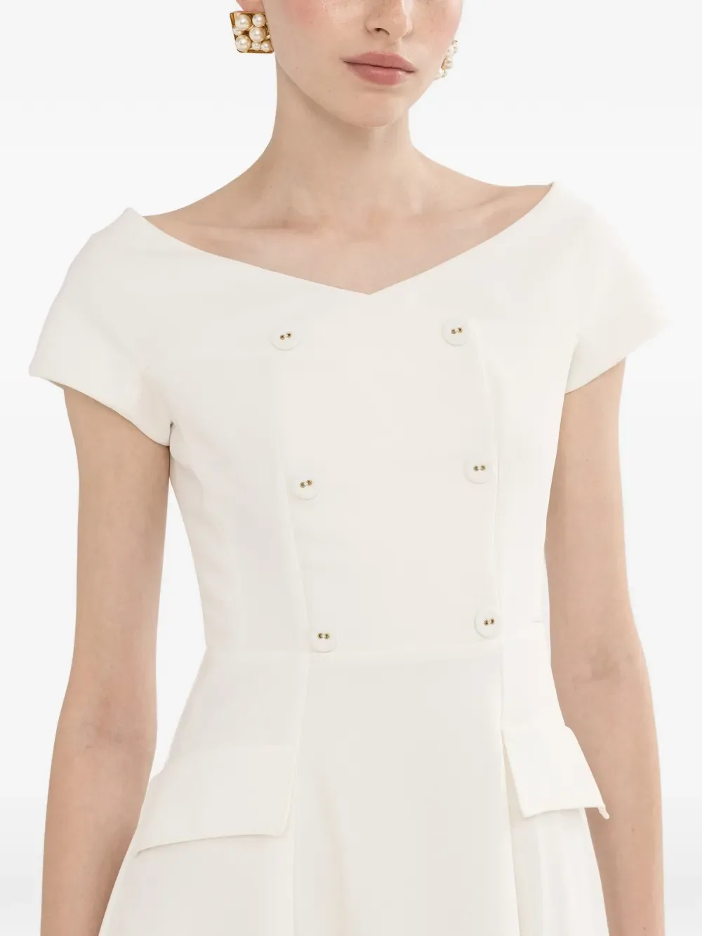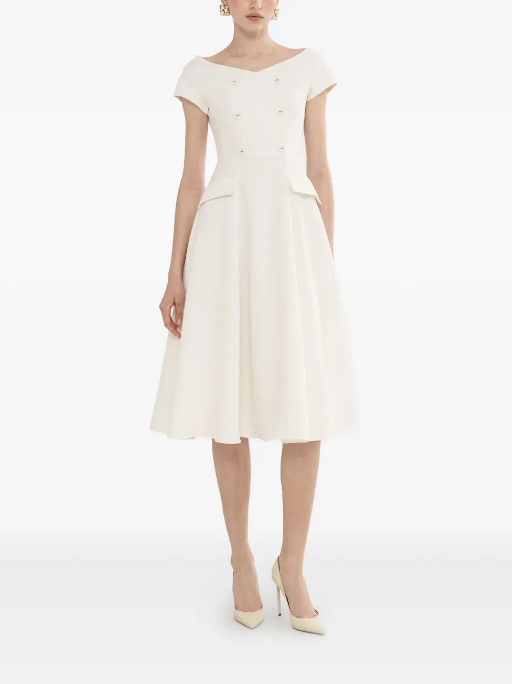 Белый креп с текстурой, короткие рукава-крылышки, детали с пуговицами, V-образный вырез, силуэт "А-силуэта"