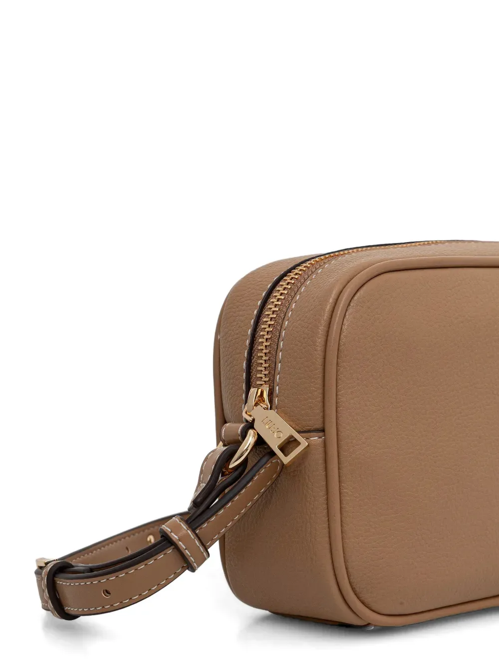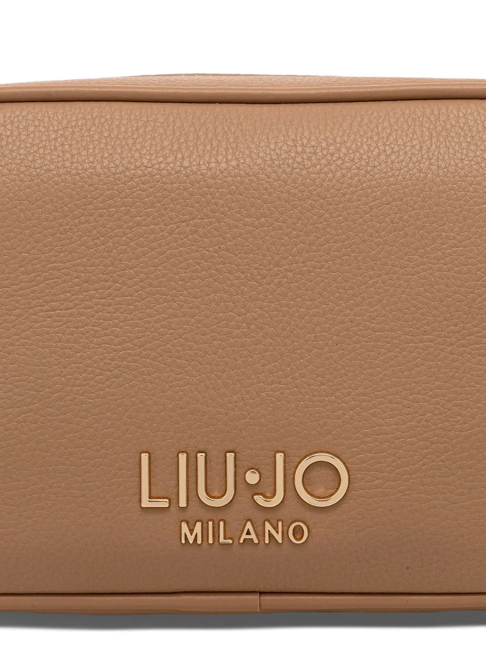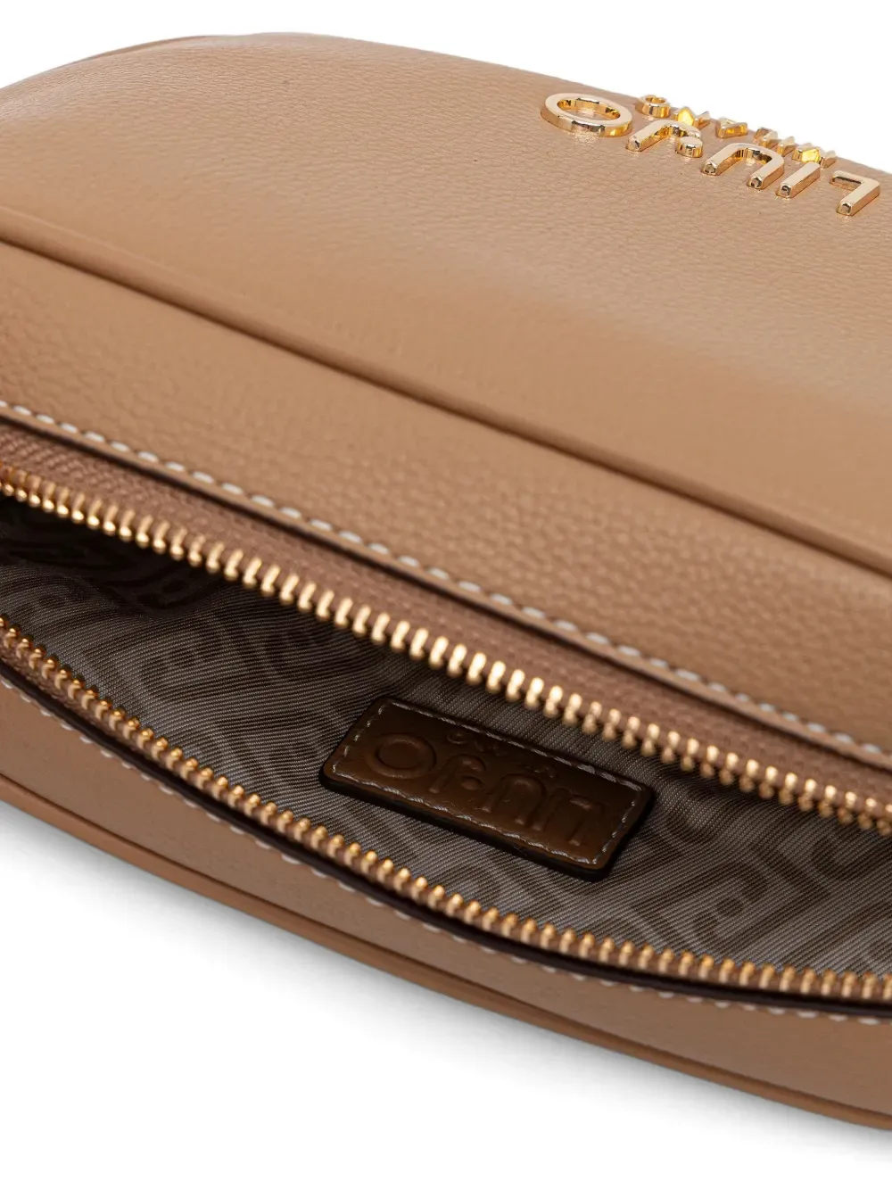 Светло-коричневая зернистая отделка, буквы-логотип, застежка-молния, съемный ремень, фурнитура золотистого оттенка