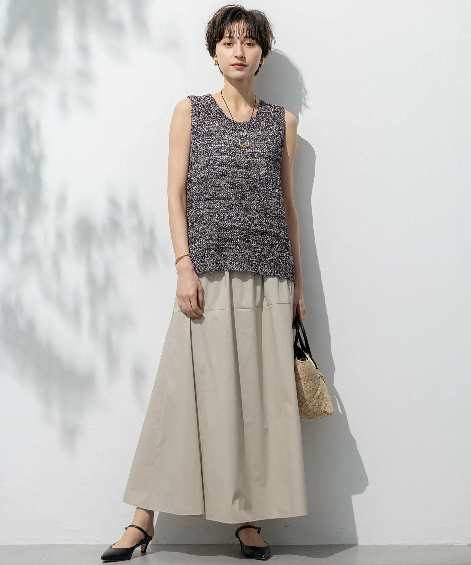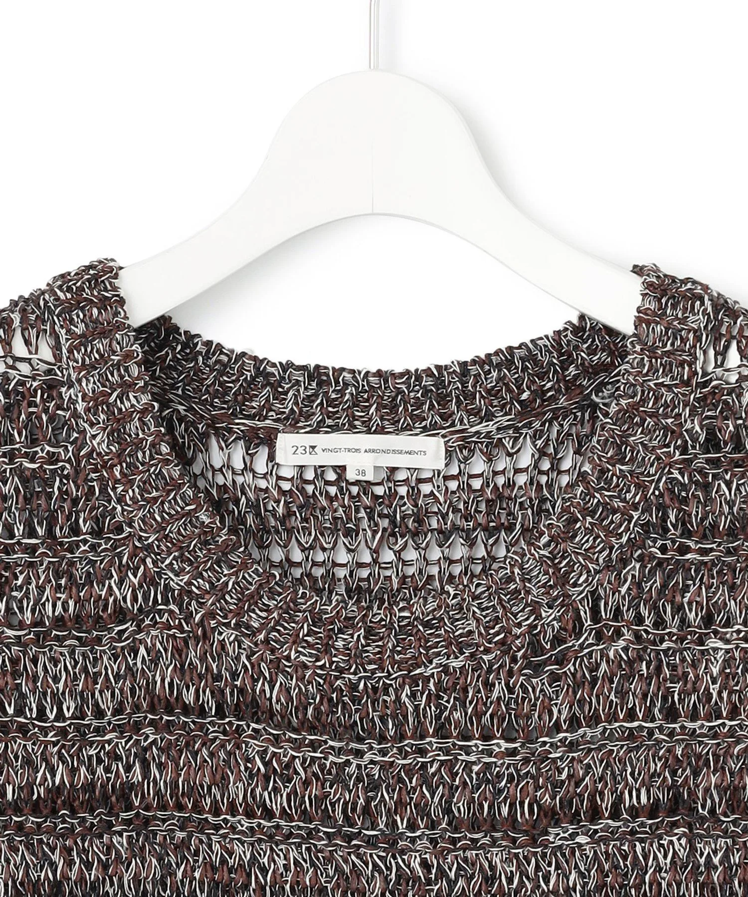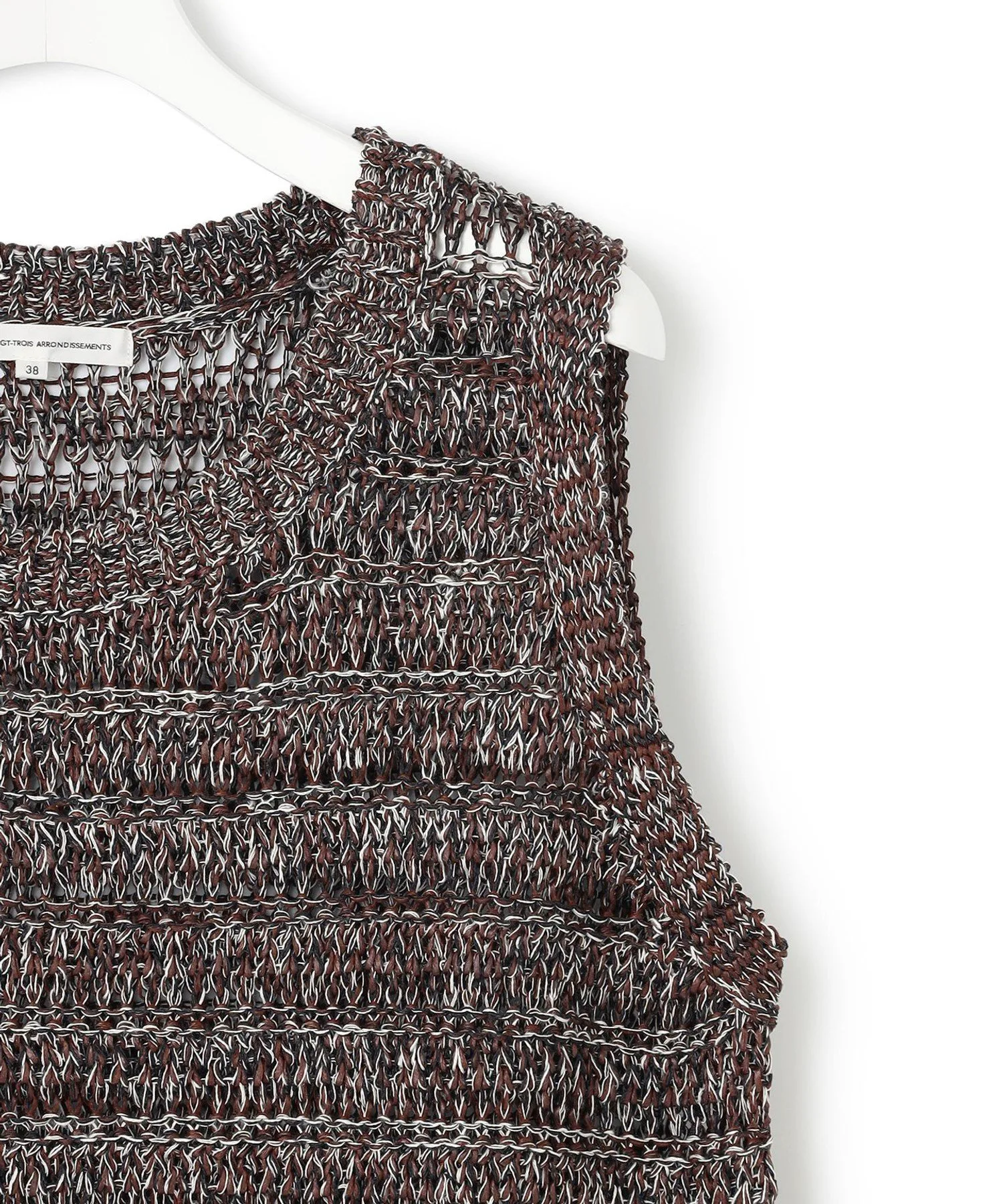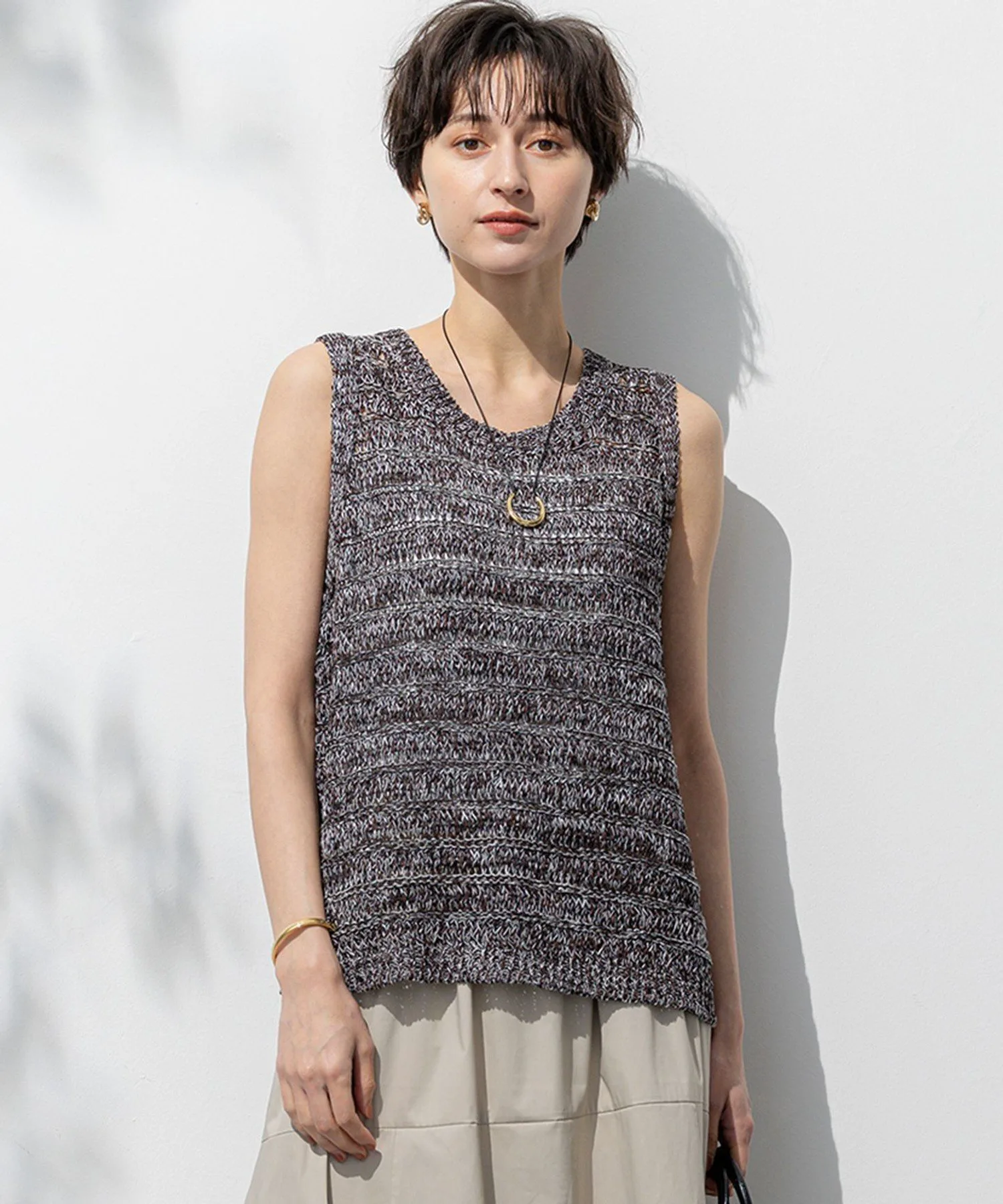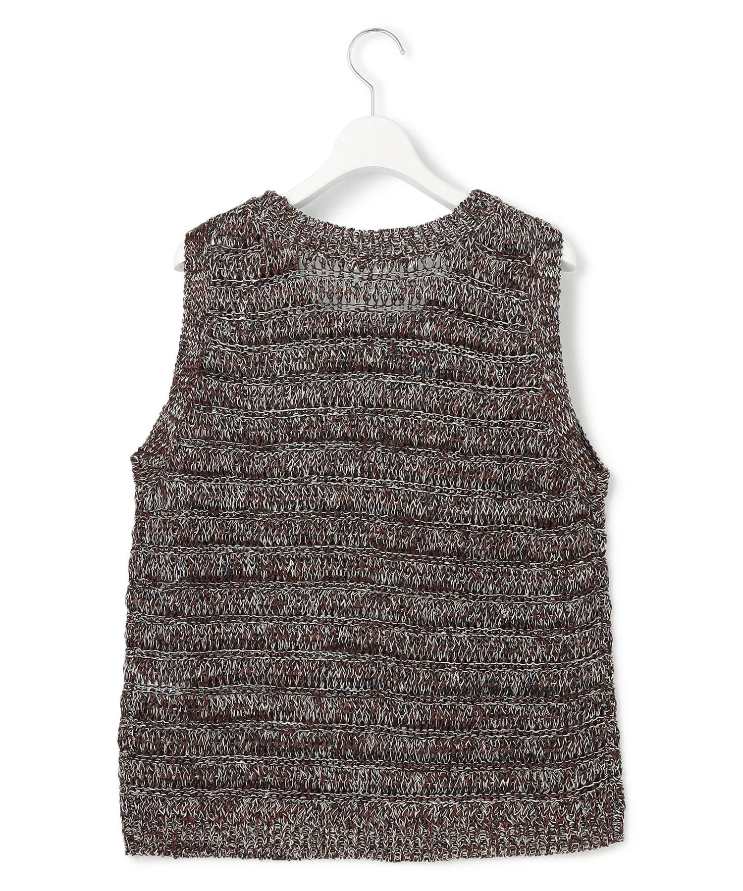 Этот трикотаж выполнен в свободной ажурной вязке из льна и бумажной пряжи. Летняя текстура создает ощущение прохлады, а круглый вырез и отсутствие рукавов делают его идеальным для середины лета. Носите его с топом-бандо или майкой под ним, или наденьте куртку в прохладную погоду. Он представлен в двух цветах: бежевом (#533), который подчеркивает естественную текстуру, и темно-коричневом (#535), который добавляет нотку элегантности к повседневным нарядам.