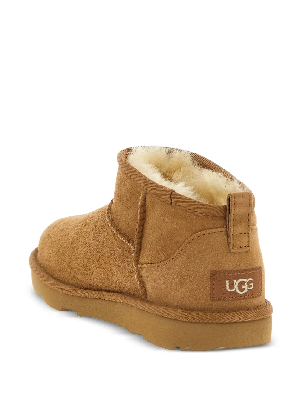 Бежевый верх с оверлочными строчками, асимметричной отделкой, логотипной нашивкой, подкладкой из овчины и подошвой из EVA