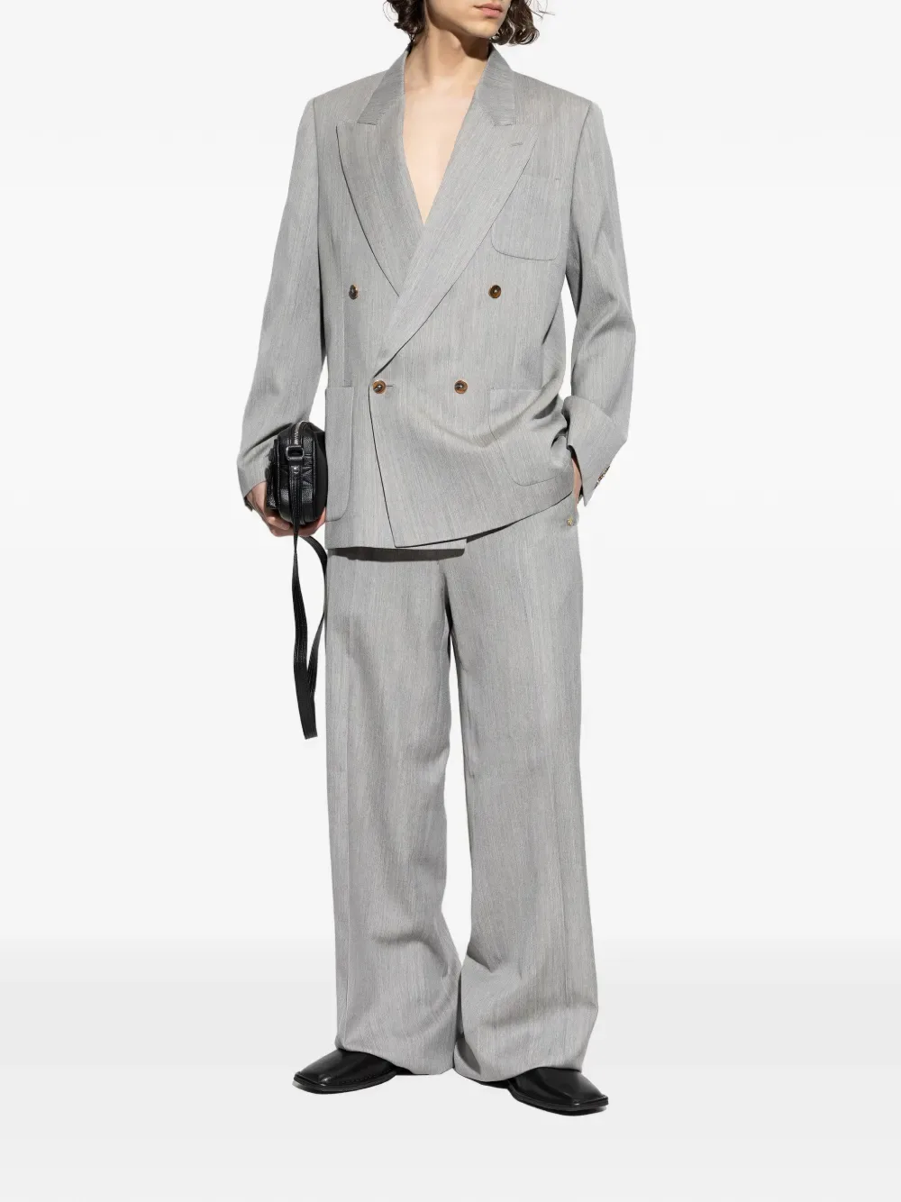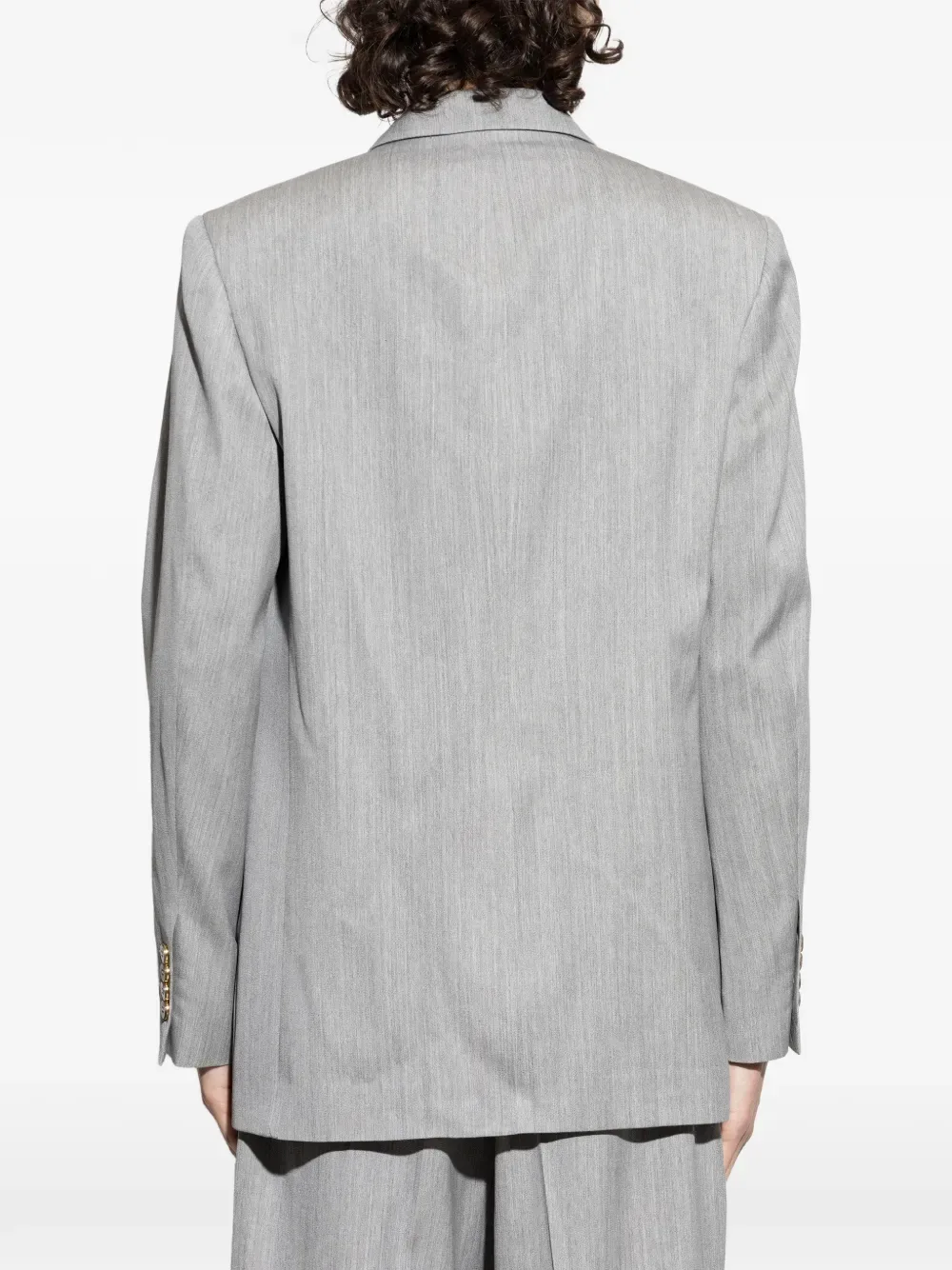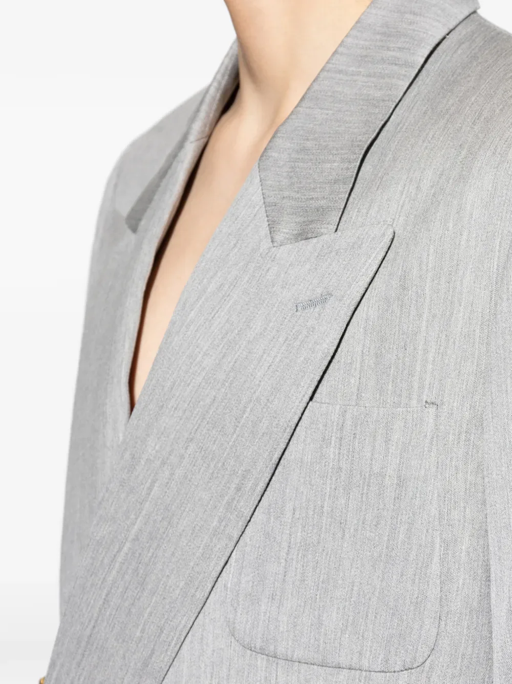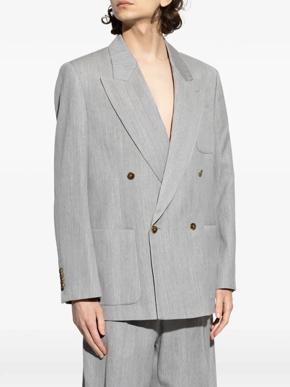 Светло-серый двубортный пиджак с пуговицами и накладными карманами