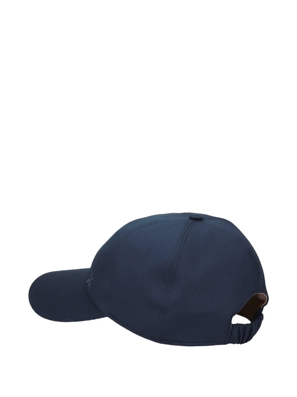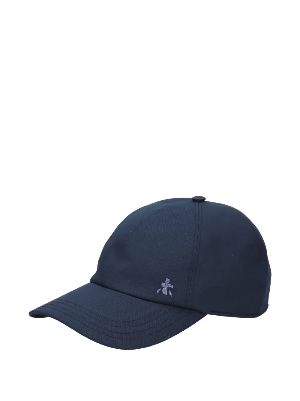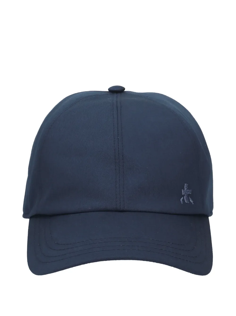Голубой хлопок, вышитые детали, эластичная вставка, тональная строчка, изогнутый козырек, верхняя пуговица