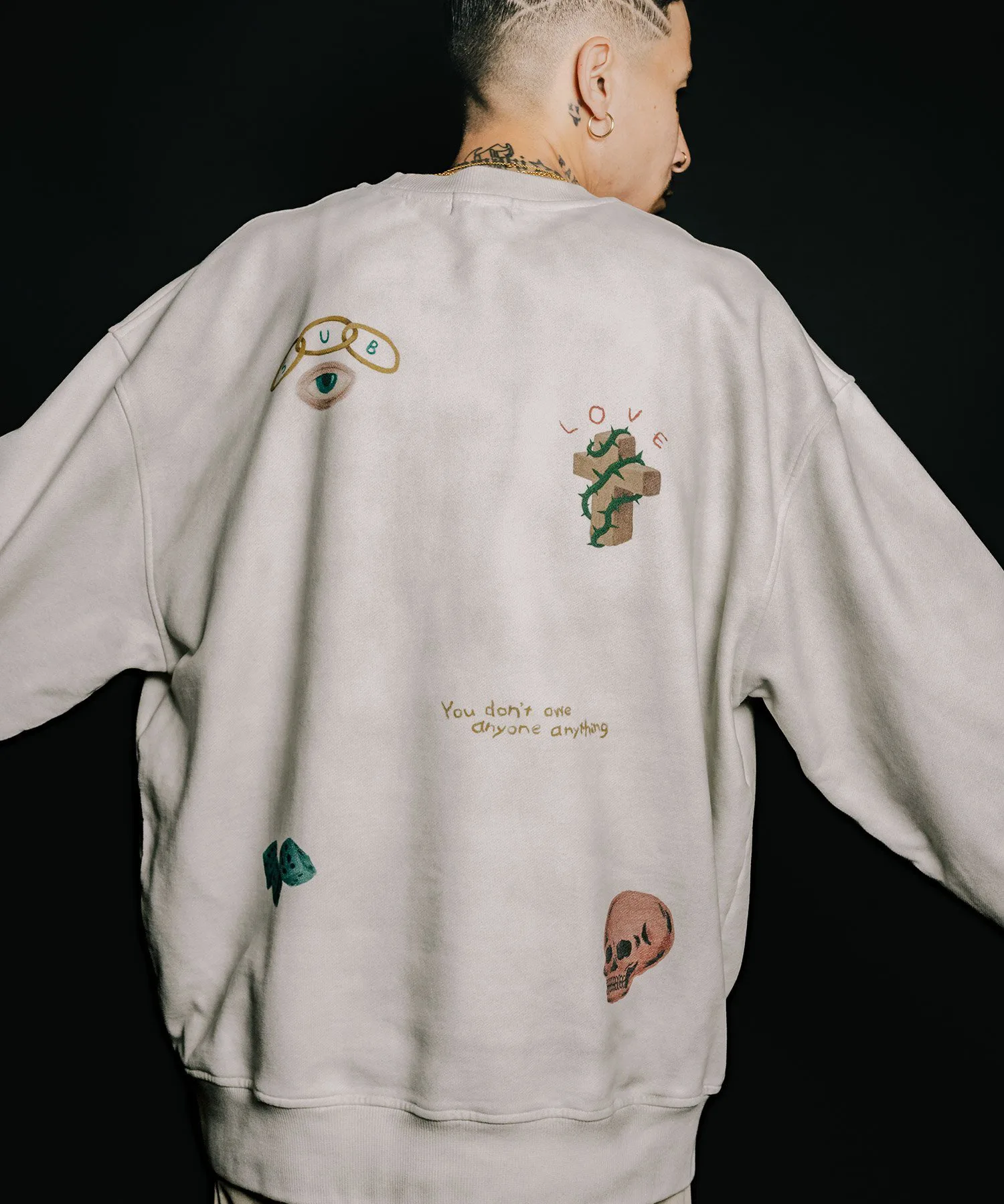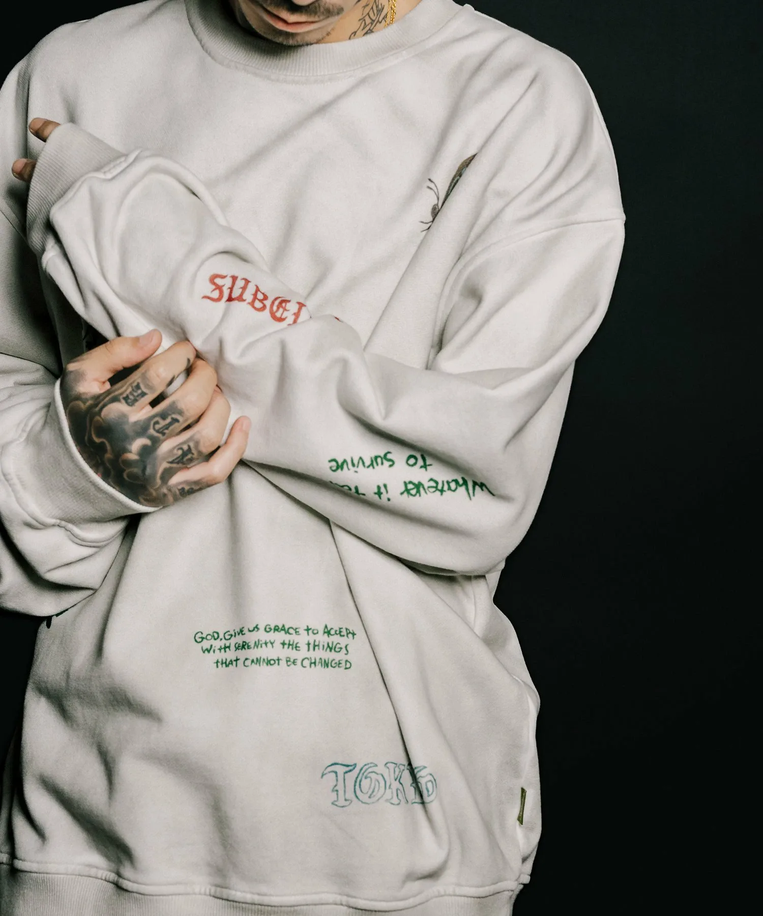 Графический рисунок по всей поверхности вдохновлен мемориальными куртками, которые используются в память о выпускных, и на которых написаны послания.