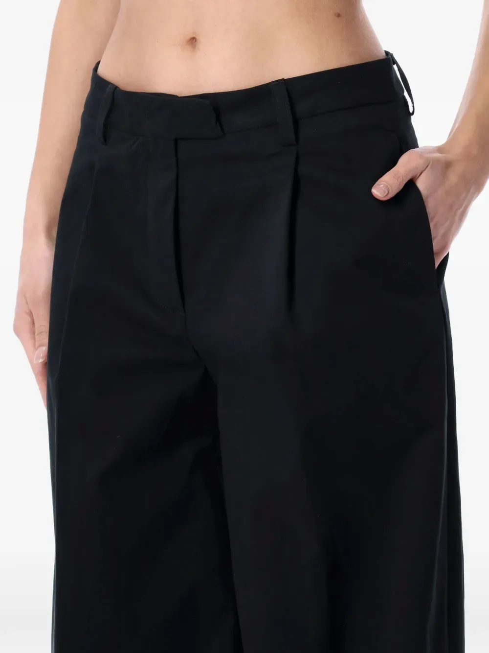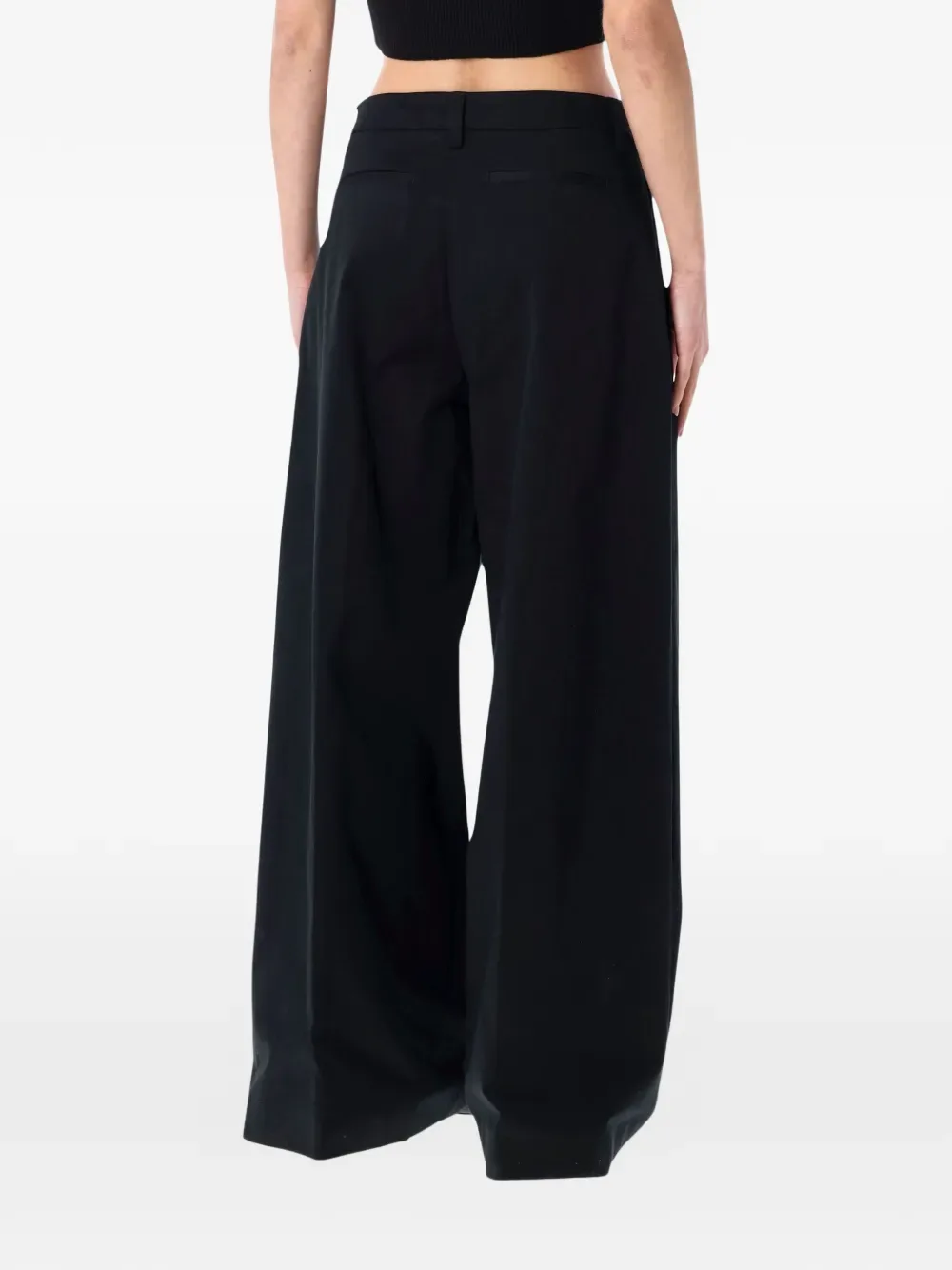 Черные брюки с защипами спереди, шлевками для ремня, прорезным карманом сзади и передними прорезными карманами