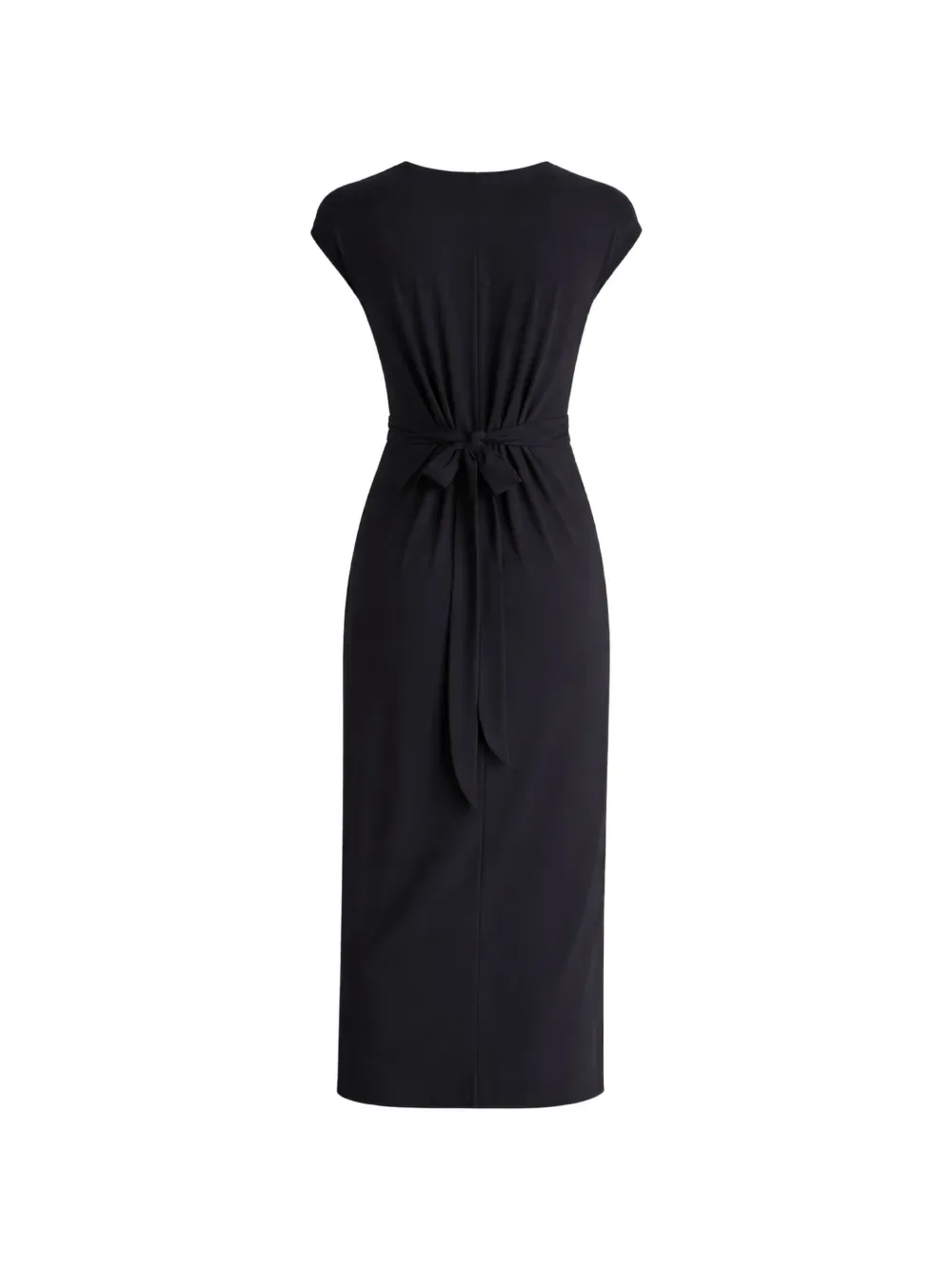Кобальтово-синее платье с завязкой на спине, короткими рукавами, присборенной отделкой, круглым вырезом и длиной миди