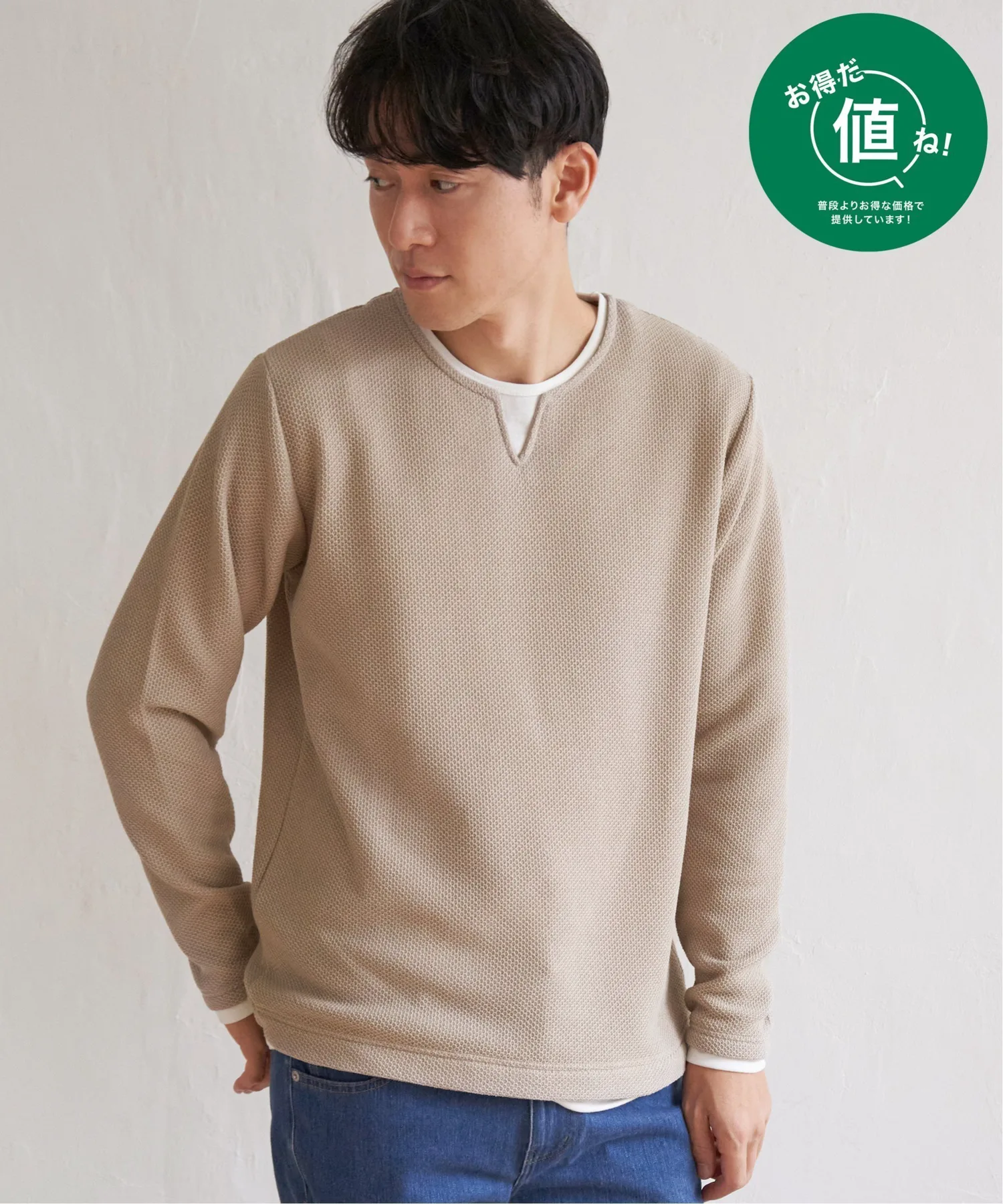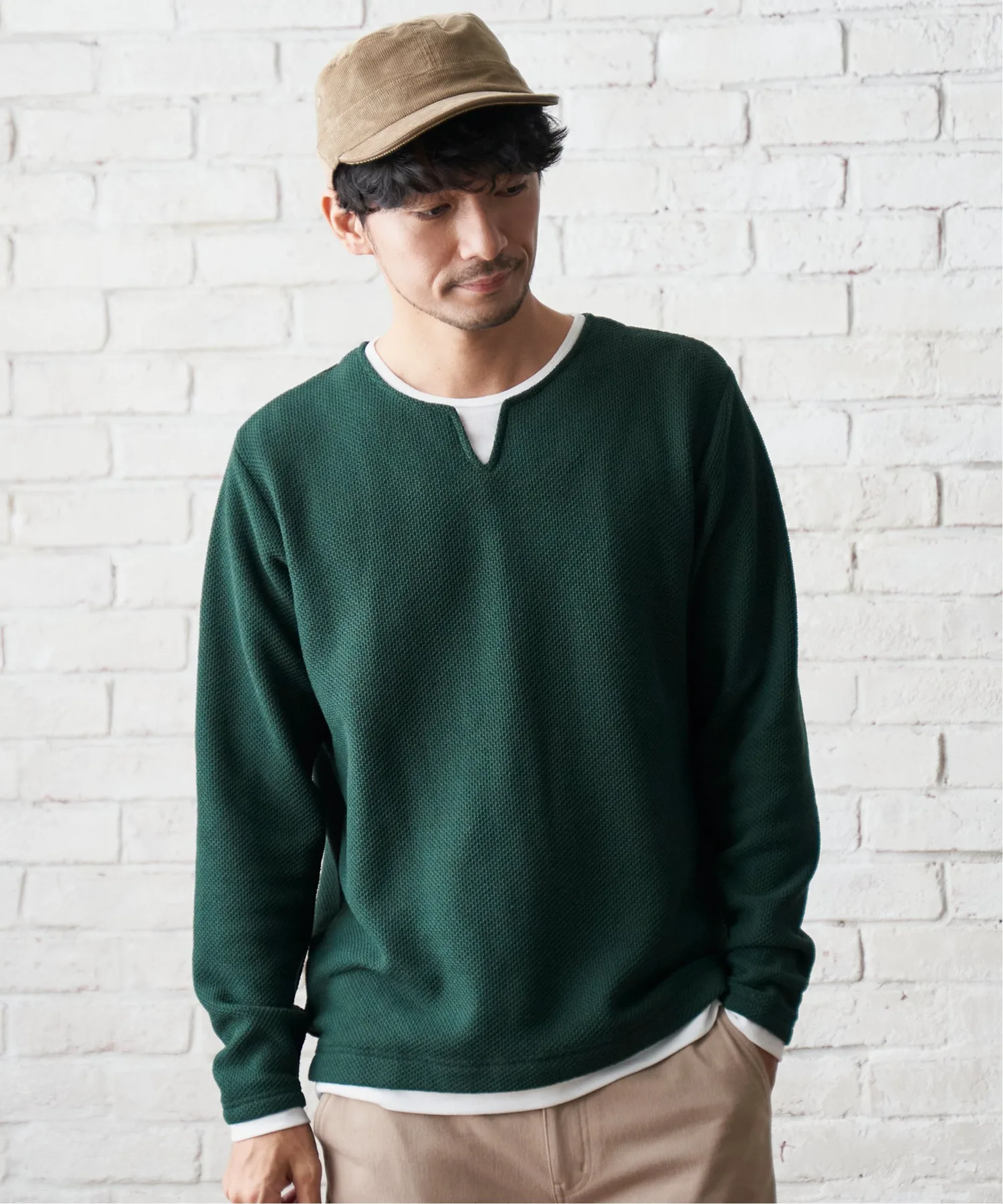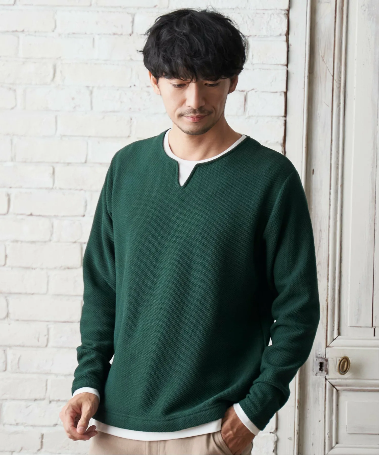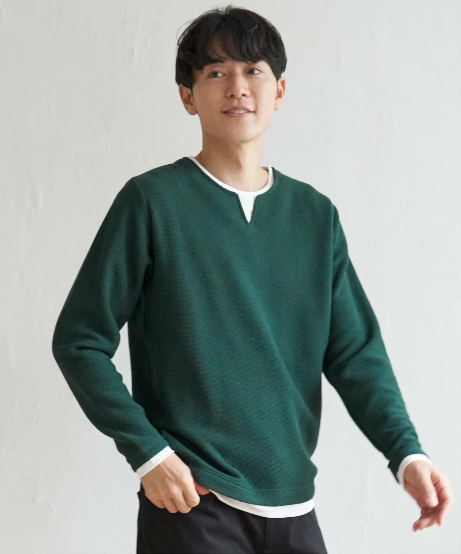 Футболка с длинными рукавами и вырезом-«замочной скважиной», создающим впечатление многослойности.