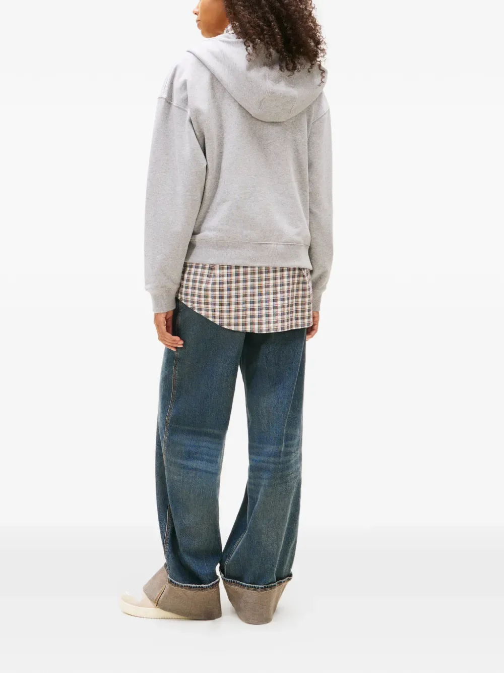 Серый худи с капюшоном, нашивкой с логотипом, передним карманом-кенгуру и застежкой-молнией