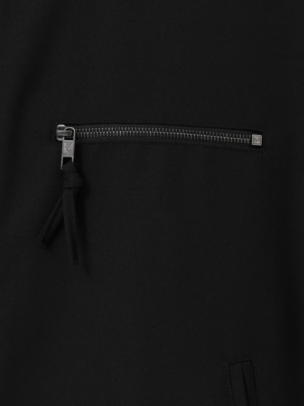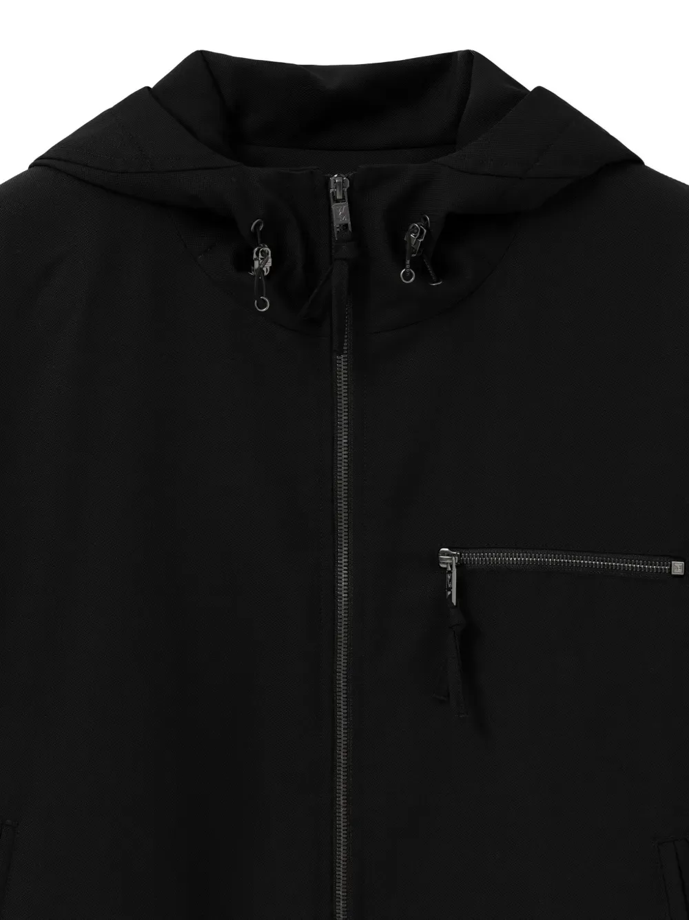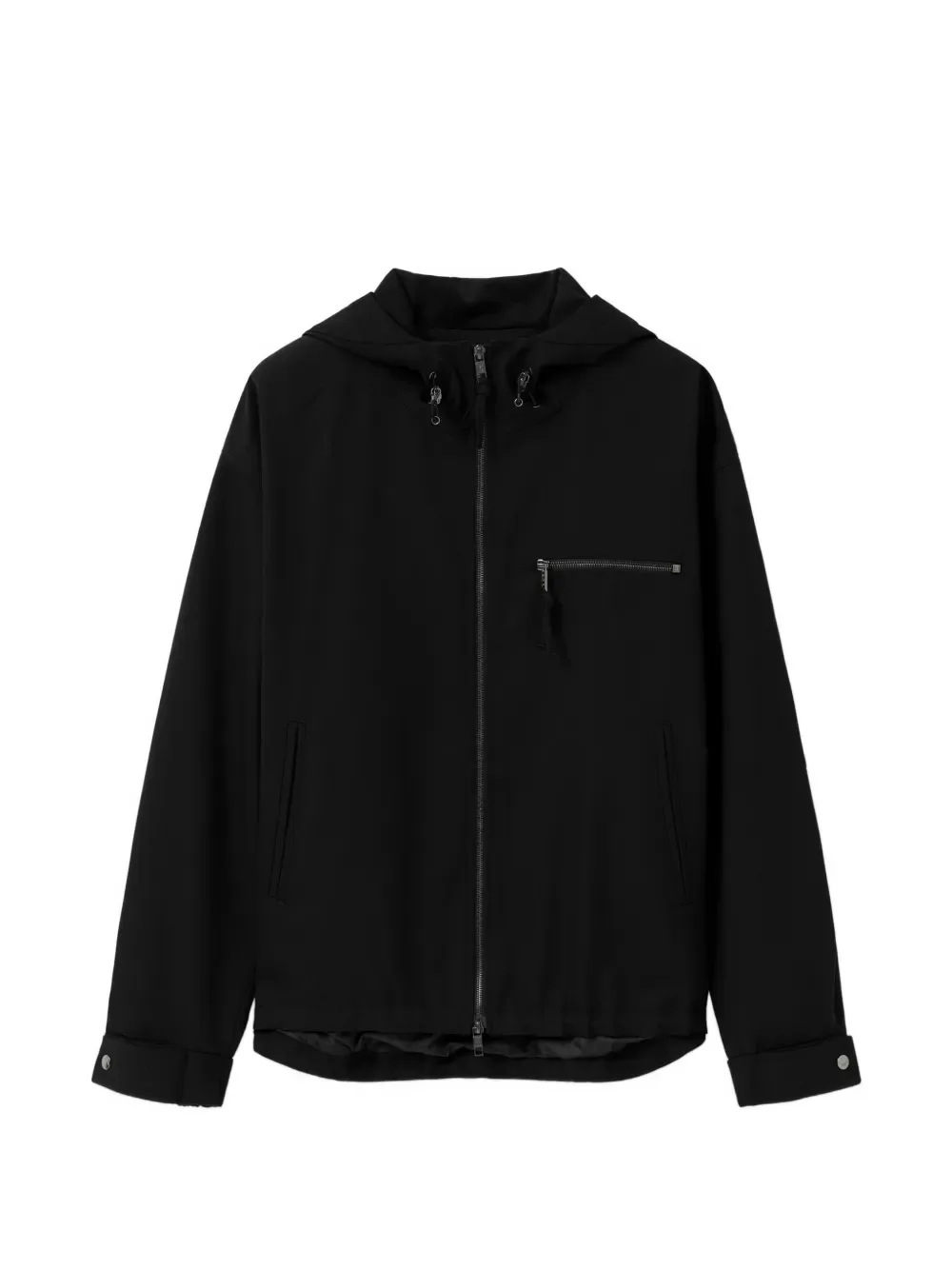 Черная шерсть, застежка-молния, нагрудный карман на молнии, манжеты на пуговицах, капюшон на кулиске