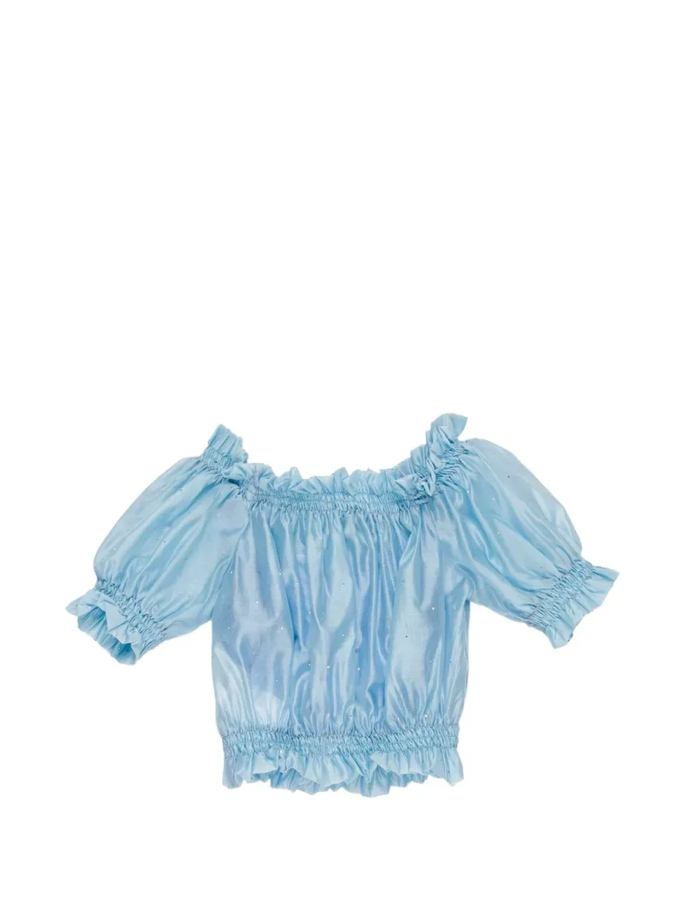 Синий топ с оборками, присборенными деталями, короткими рукавами, круглым вырезом и эластичным подолом