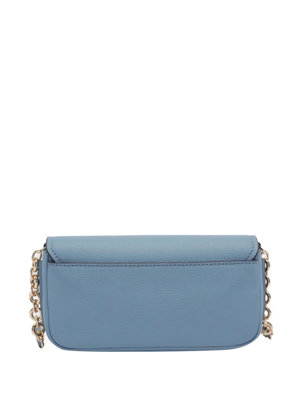 Светло-голубая телячья кожа, фурнитура золотистого оттенка, магнитная застежка, цепочка-декор, внешний карман