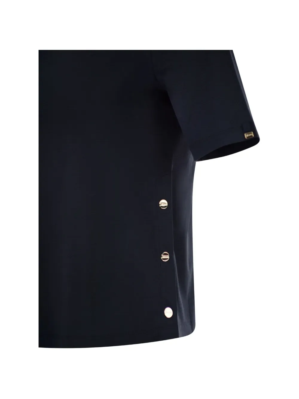 Синий свитер с круглым вырезом, короткими рукавами, логотипом, боковыми разрезами и фурнитурой золотистого оттенка