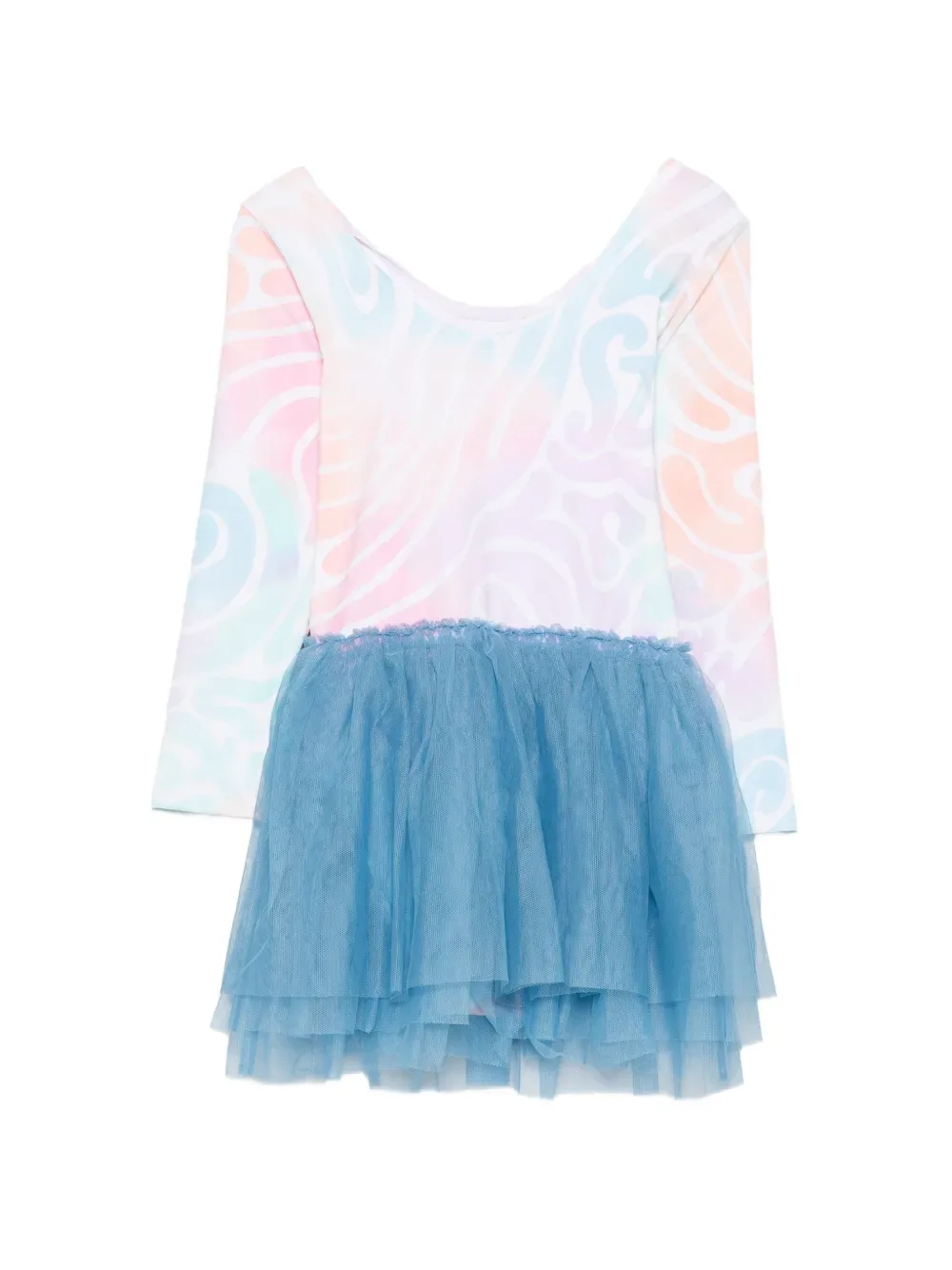 Синее и разноцветное платье с круглым вырезом, длинными рукавами и многослойной юбкой