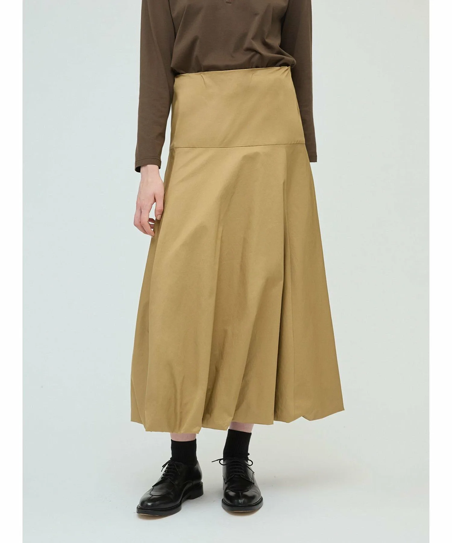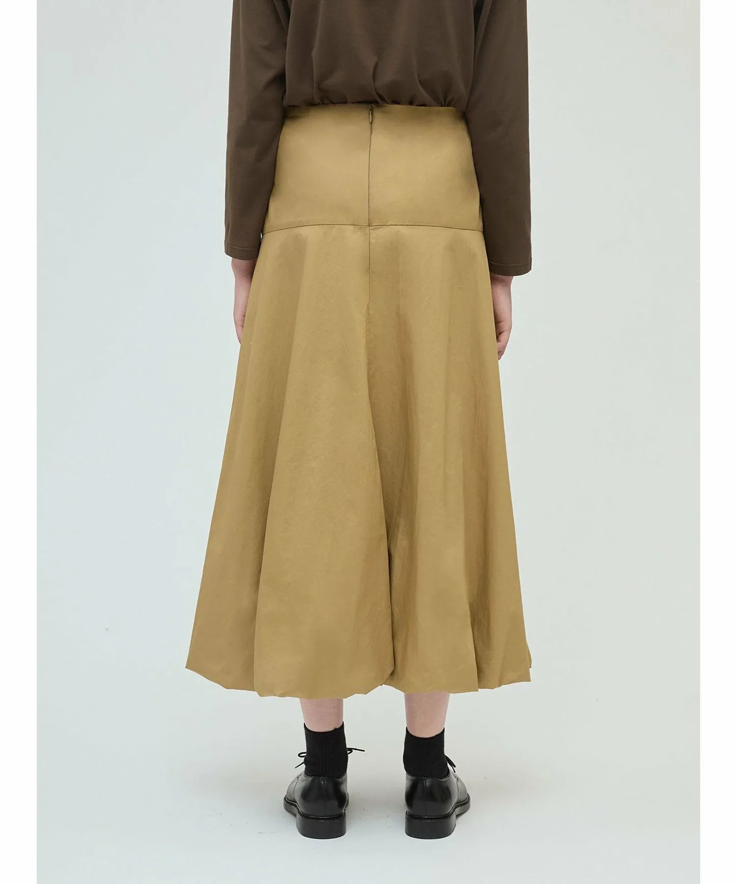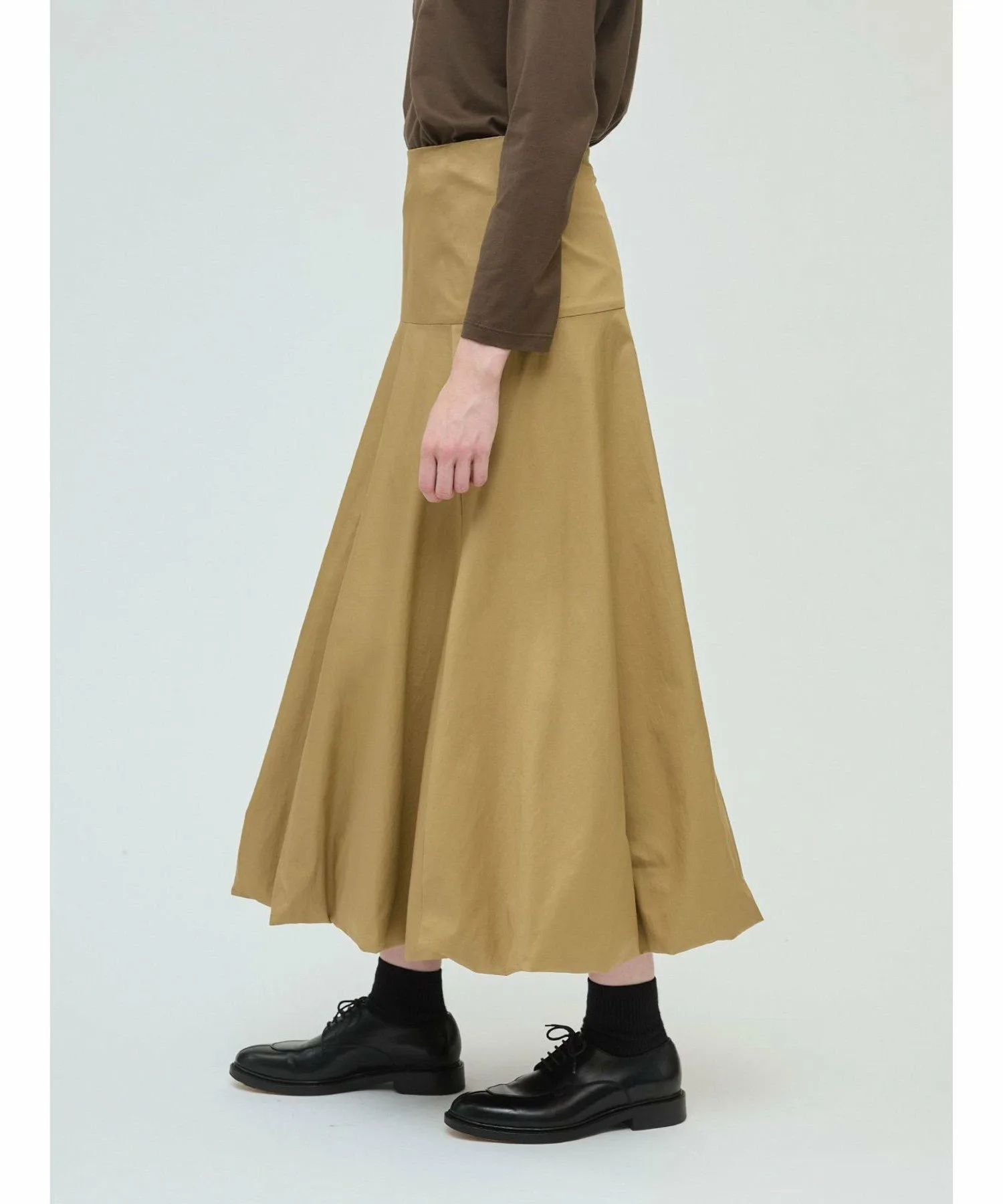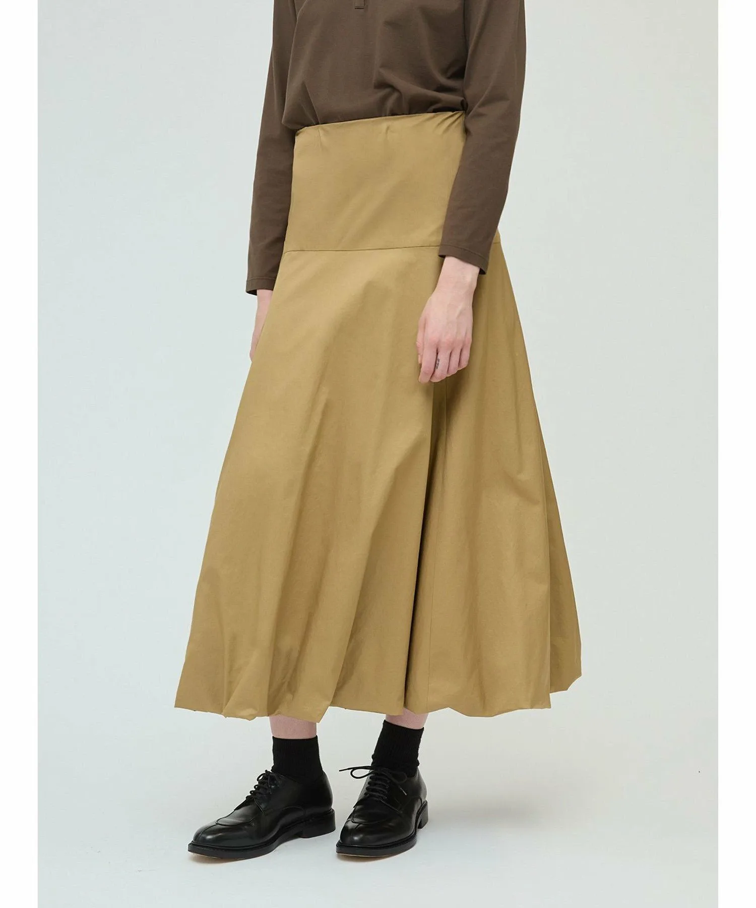 Эта длинная расклешенная юбка-баллон — свежий тренд этого сезона. Стильная модель с силуэтом «приталенное и расклешенное». Юбка скроена на бедрах, что придает ей аккуратный, элегантный вид, не создавая при этом излишней пышности, а расклешенный силуэт создает впечатляющий эффект. В зависимости от верха, эту юбку можно носить как с деловым, так и с повседневным образом. Мы также рекомендуем заправлять в нее рубашку. Эластичный пояс сзади на талии обеспечивает плотную посадку, а застежка-молния сзади на талии облегчает надевание и снимание. Подготовьтесь к осеннему сезону с этой свежей юбкой от mizuiro ind.