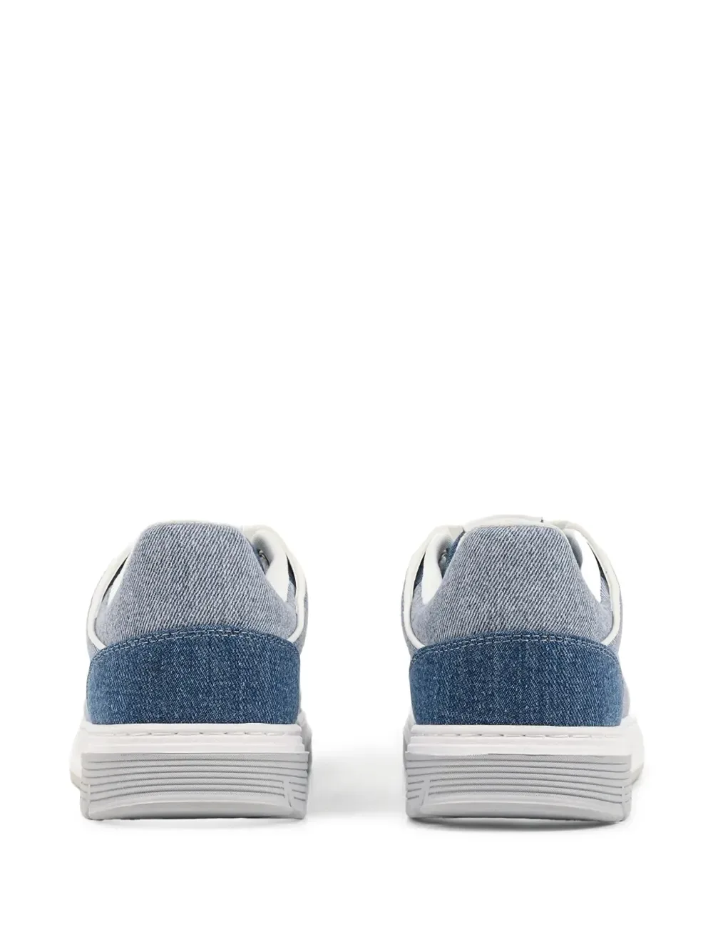 Светло-голубой цвет, многослойный дизайн, логотип, шнуровка, рифленая подошва, круглый нос