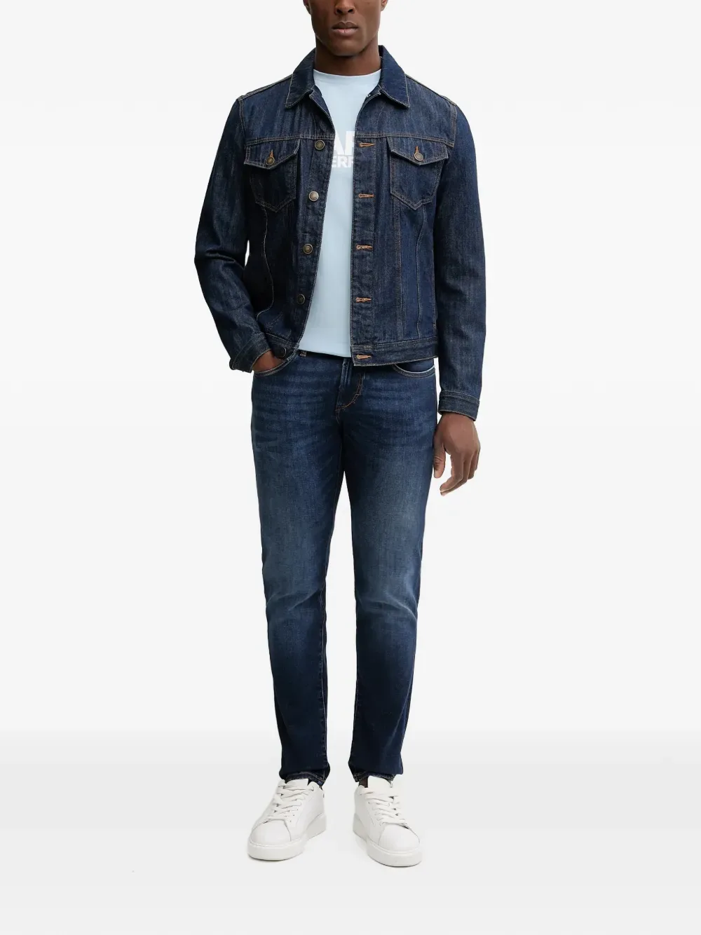 Синие накладные карманы, тонирующая отстрочка, застежка на пуговицы, приталенный крой