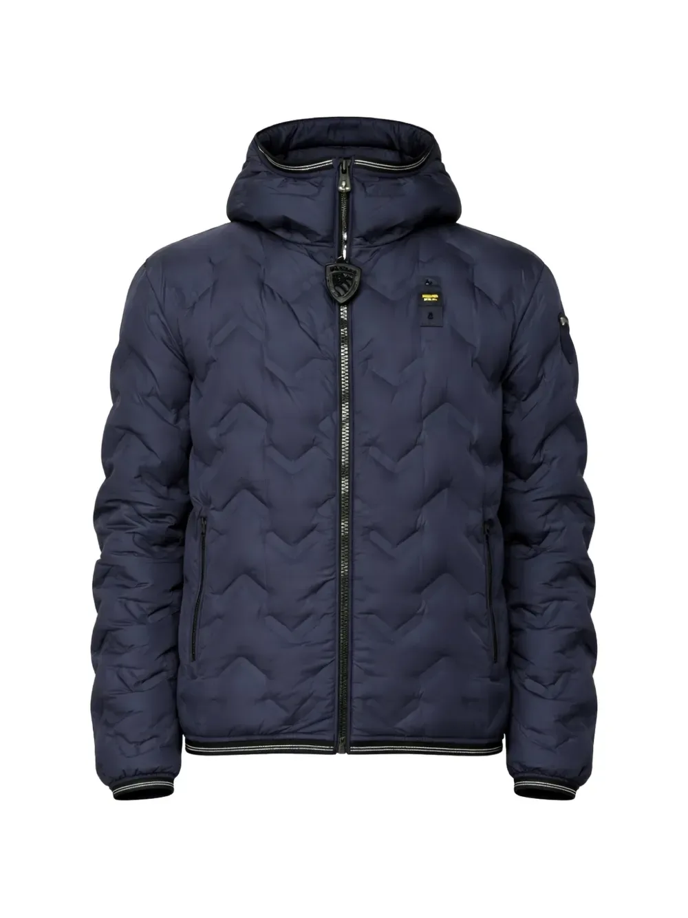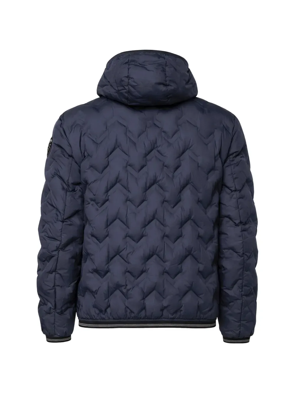 Темно-синий пуховик с зигзагообразной стежкой, капюшоном, застежкой-молнией, эластичными отделками и нашивкой с логотипом