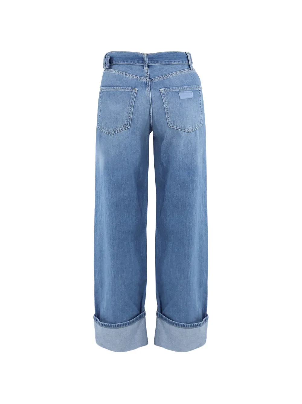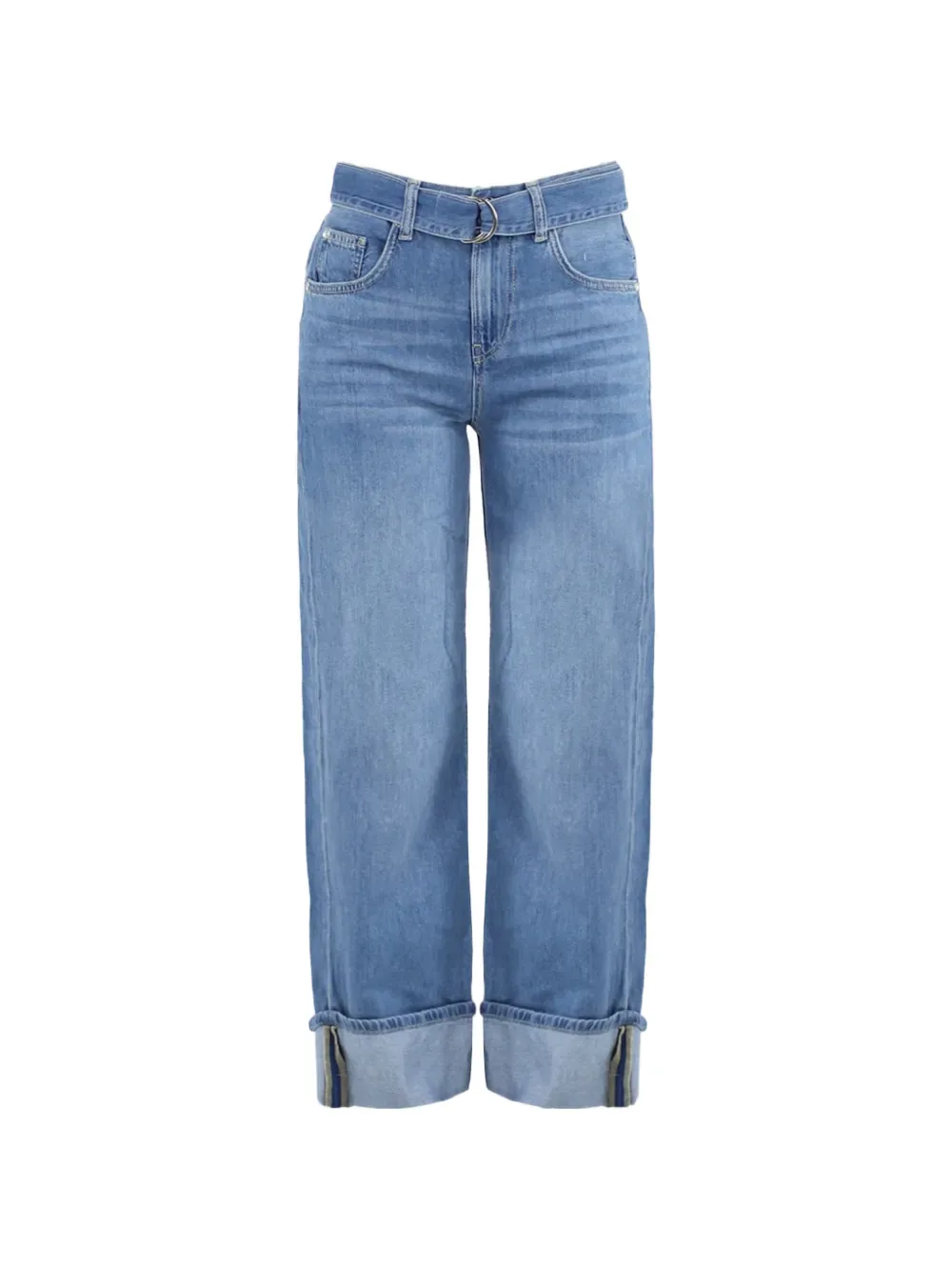 Голубые джинсы с поясом, подворотами и пятью карманами