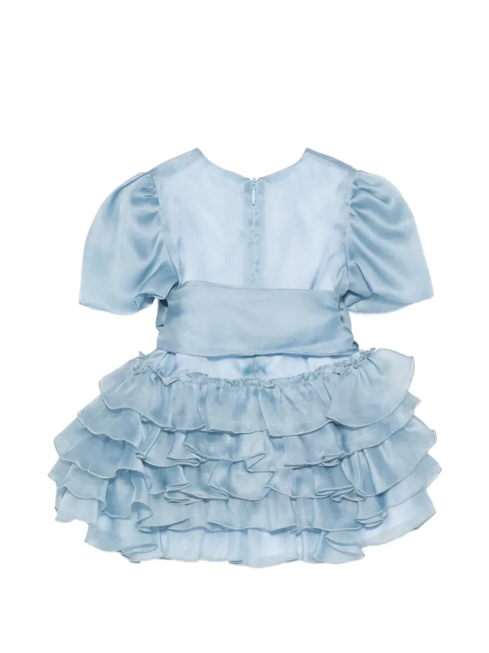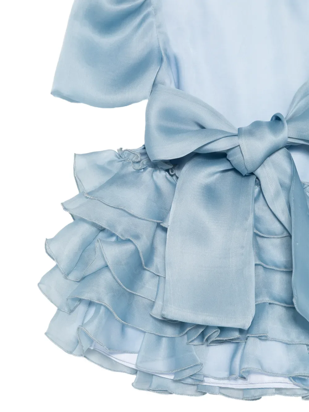 Голубое платье из сахарной бумаги с бантом на поясе, оборками, короткими рукавами, застежкой-молнией сзади