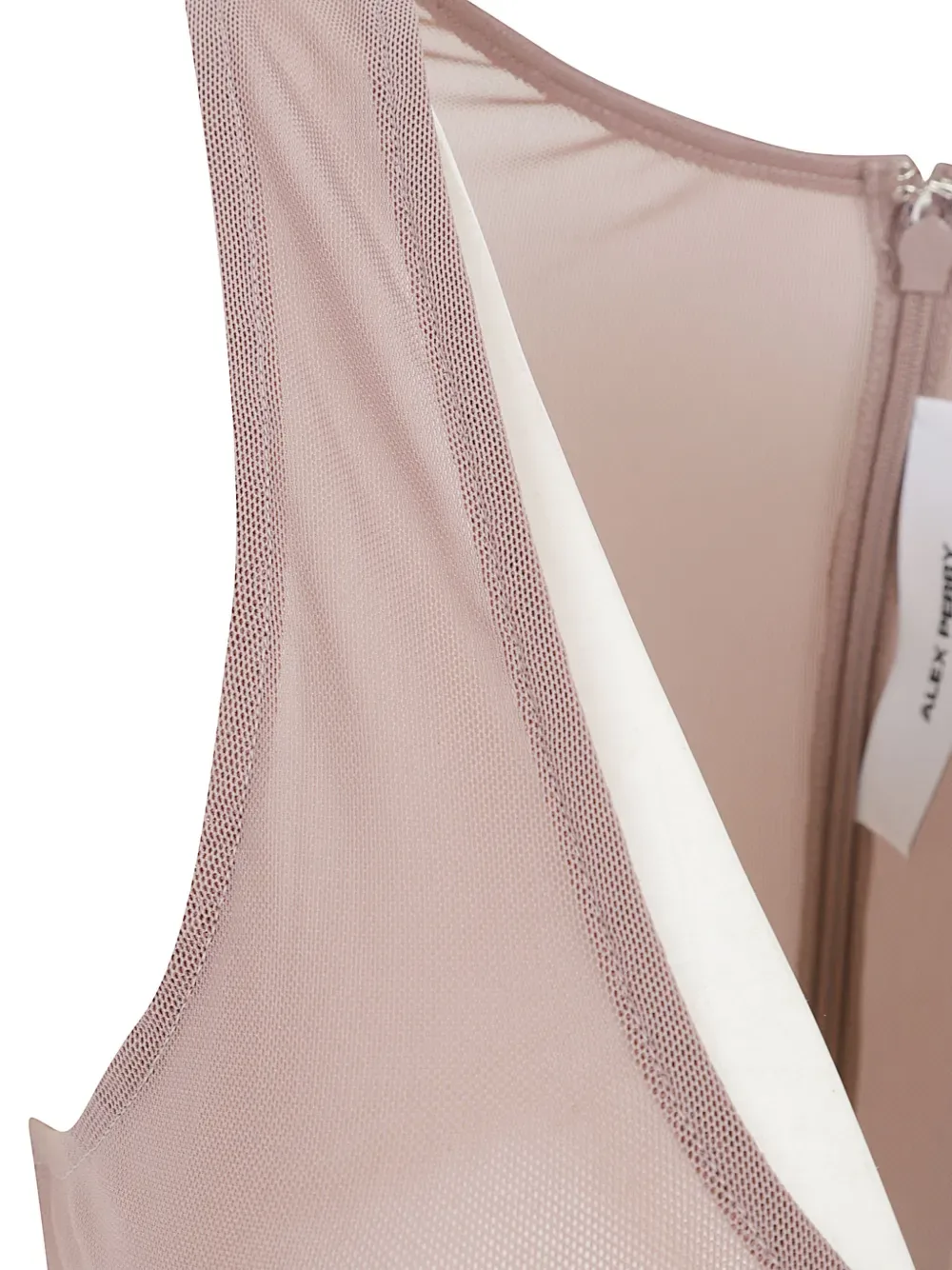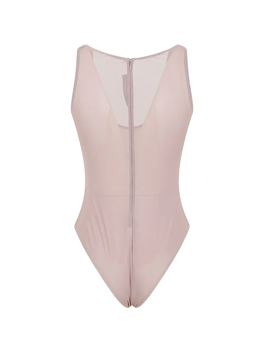 Бежевый топ из сетки на молнии, с круглым вырезом и без рукавов. Напоминаем, что этот предмет необходимо примерять поверх вашей собственной одежды.