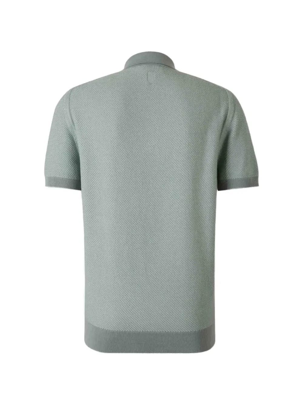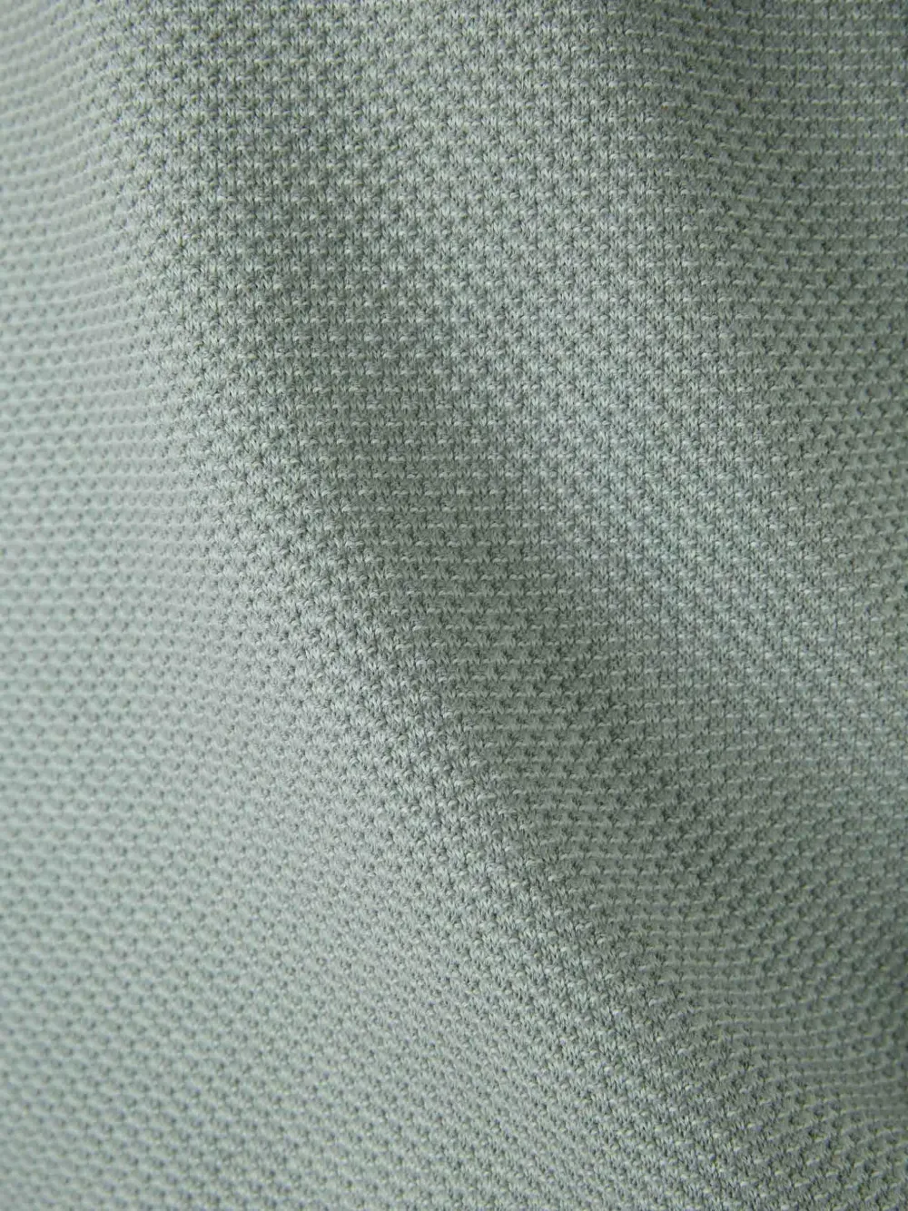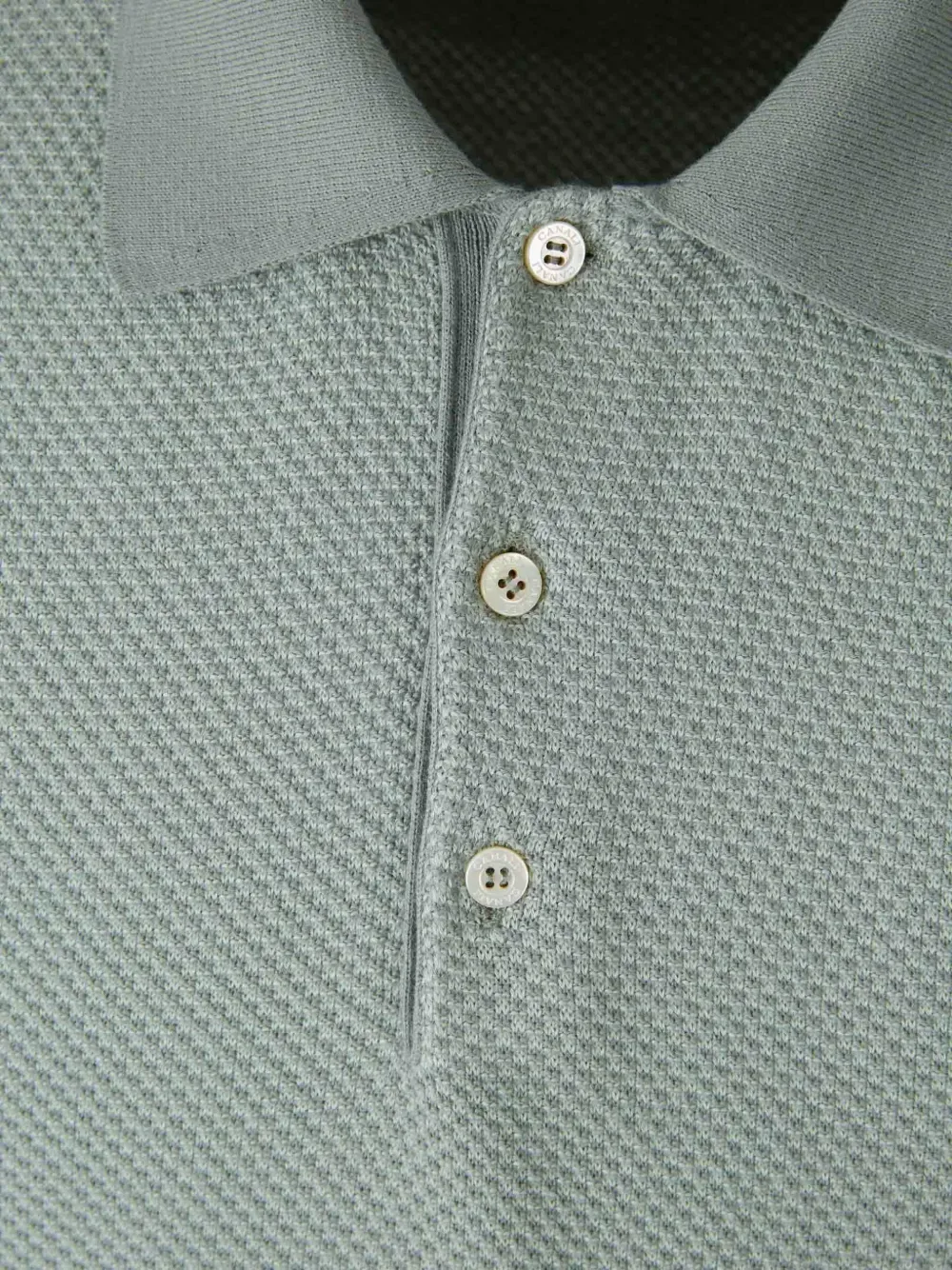 Серый фактурный трикотаж, застегивается на пуговицы, короткие рукава, рубчатый низ, рубчатые манжеты