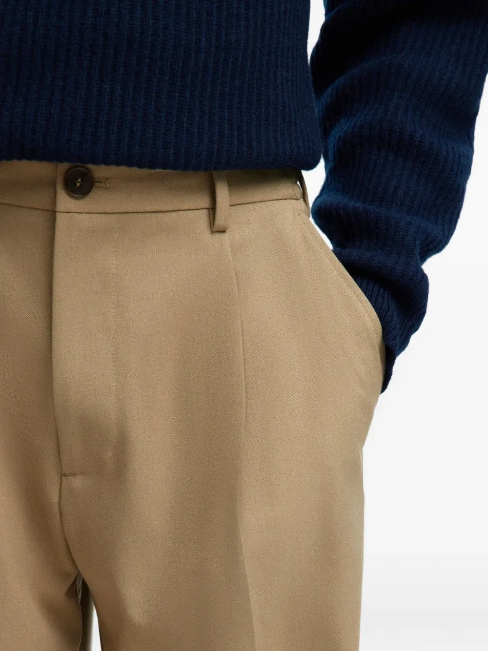 Бежевый; застежка на пуговицы; шлевки для ремня; боковые карманы в шве; задние прорезные карманы