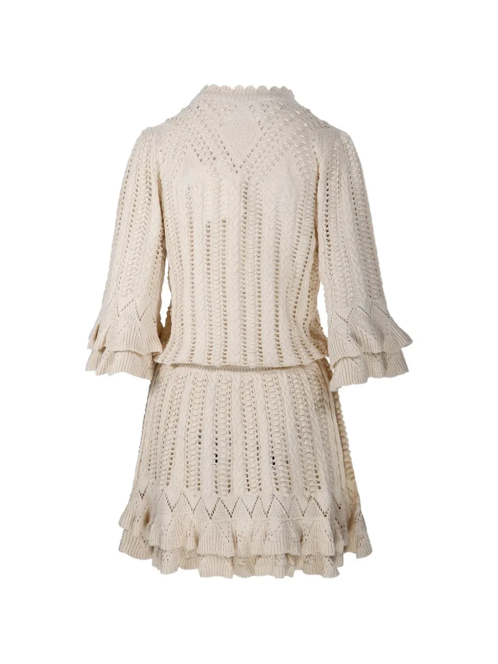 Офлайн вязаный джемпер с оборками, круглым вырезом, рукавами три четверти и ажурными вставками