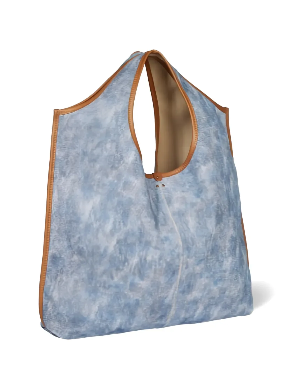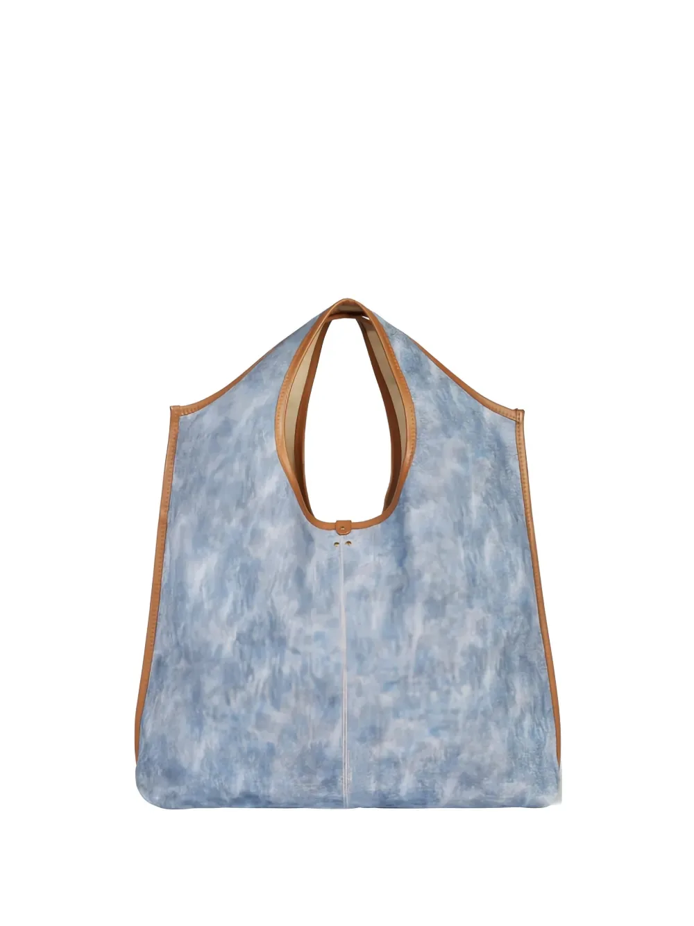 Потертого синего цвета, с кожаными отделками, с верхней ручкой, на одну пуговицу