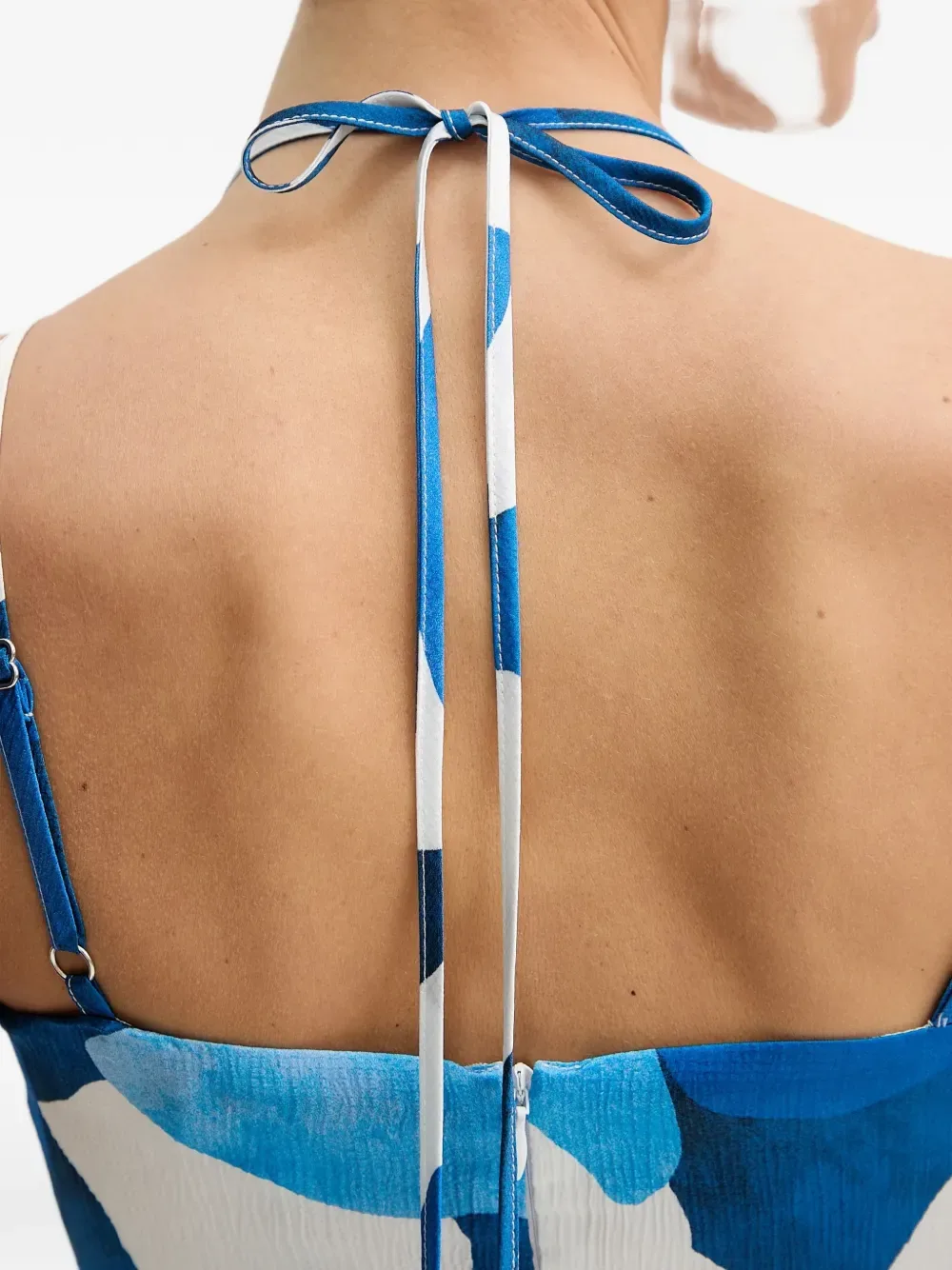Голубое платье с цветочным принтом, V-образным вырезом, тонкими бретелями, застежкой-молнией и завязками на спине