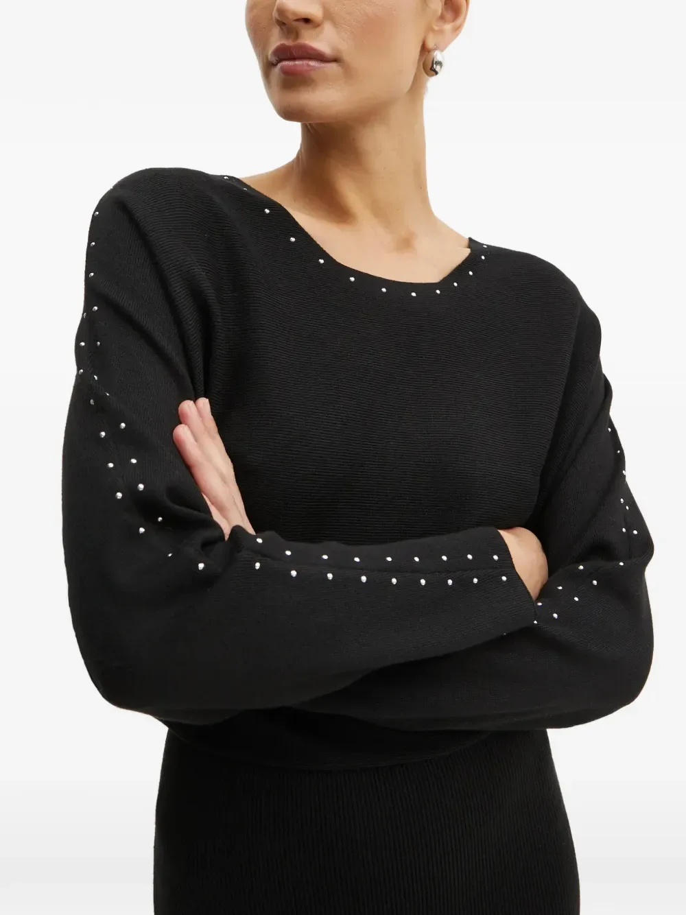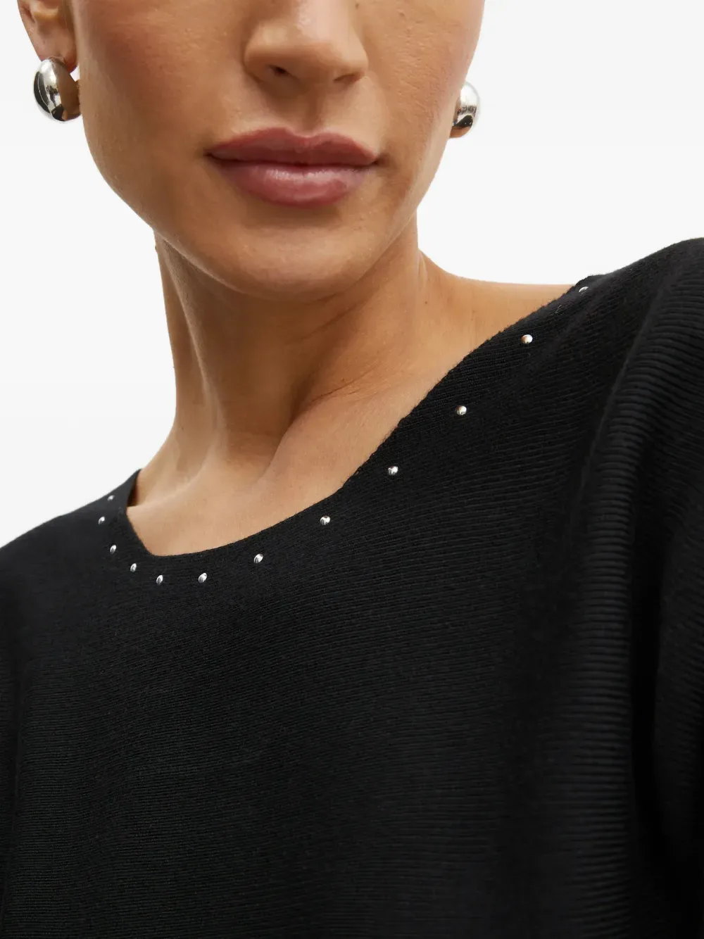 Черный вязаный топ в рубчик с круглым вырезом, украшением в виде заклепок и разрезом сбоку