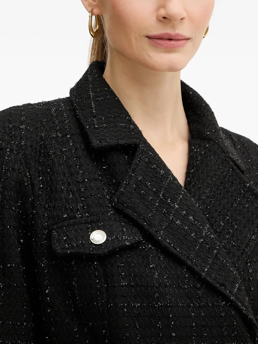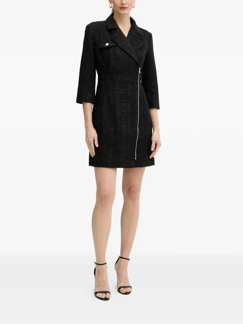 Черная с фактурной отделкой, фурнитура серебристого оттенка, детализация с карманами, рукава три четверти, скрытая застежка-молния