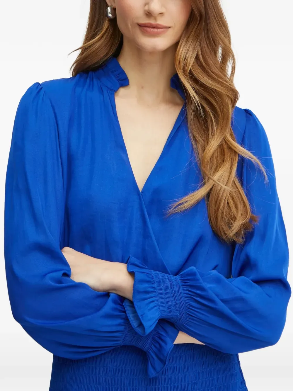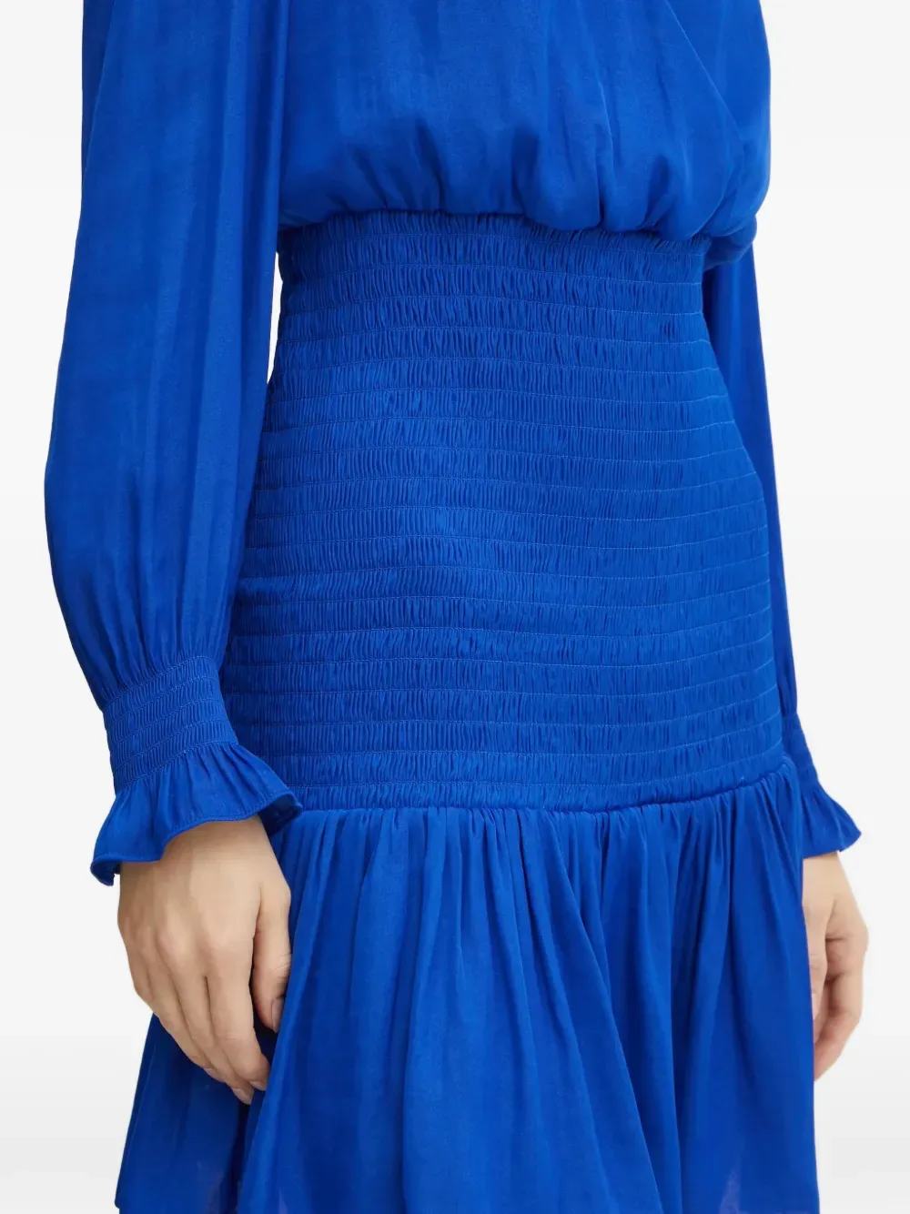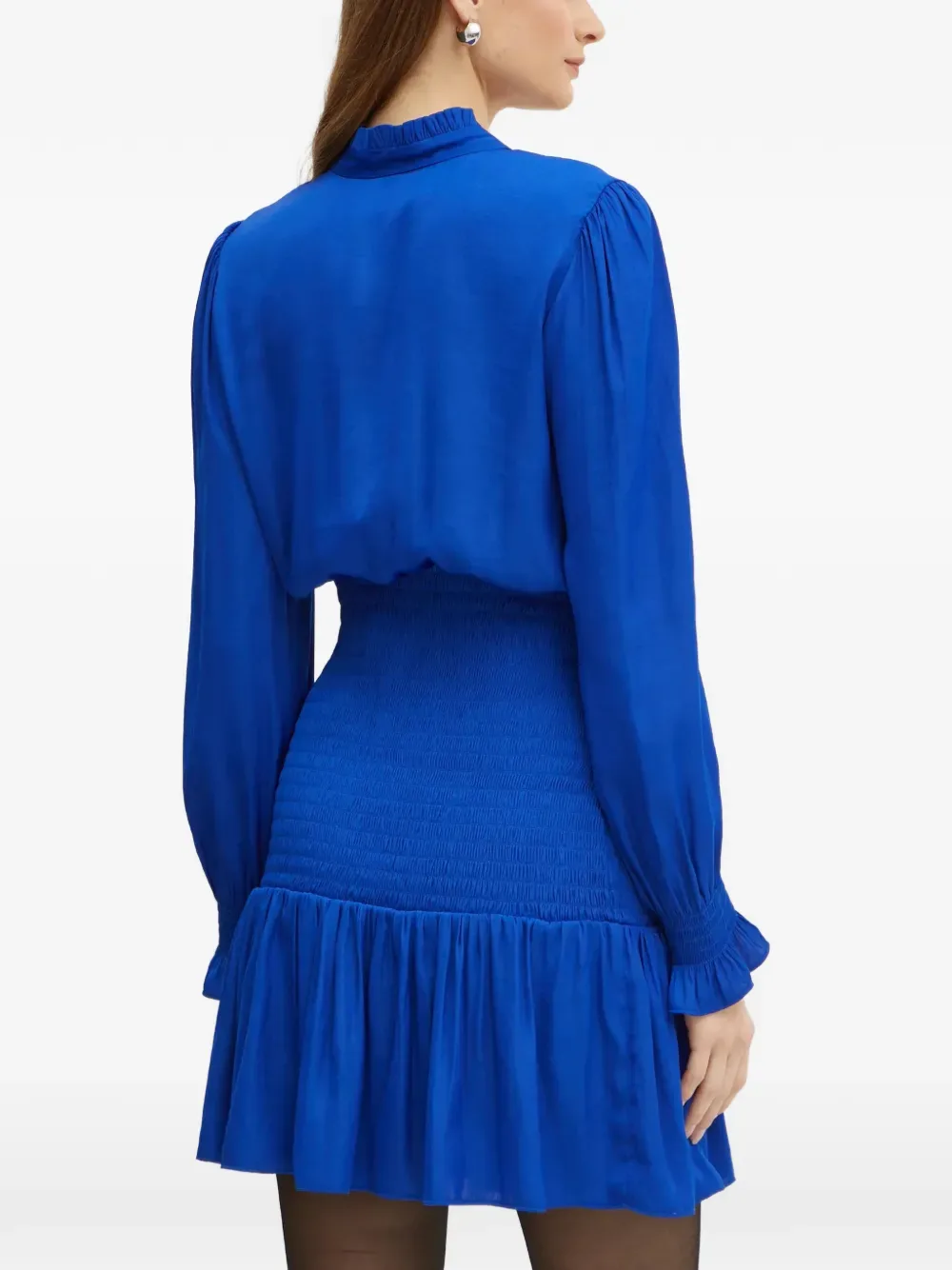Голубое мини-платье с V-образным вырезом, оборками, длинными рукавами и присборенной талией