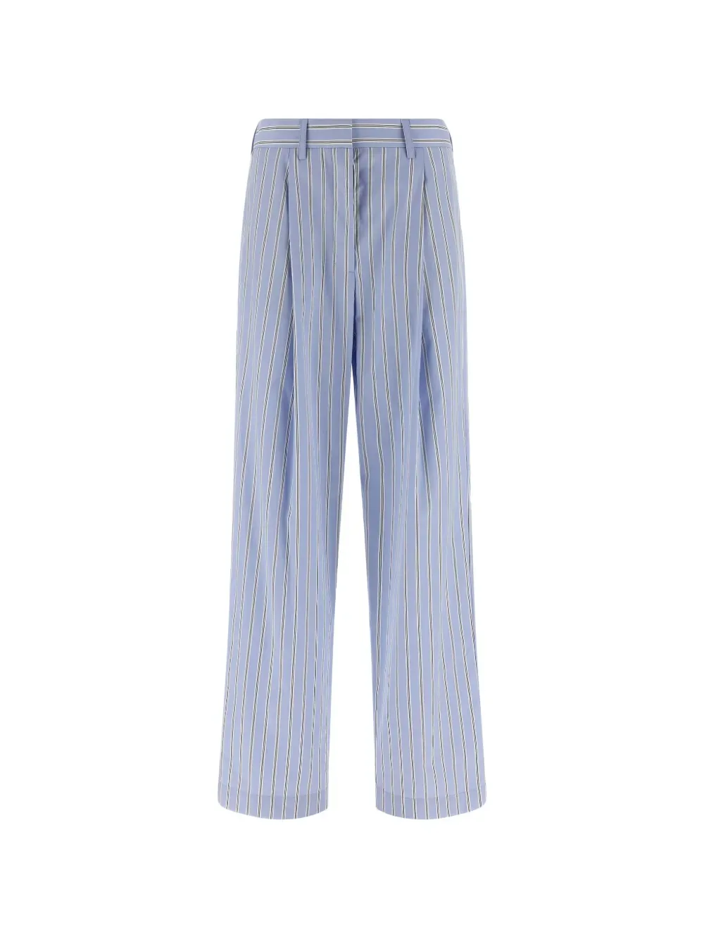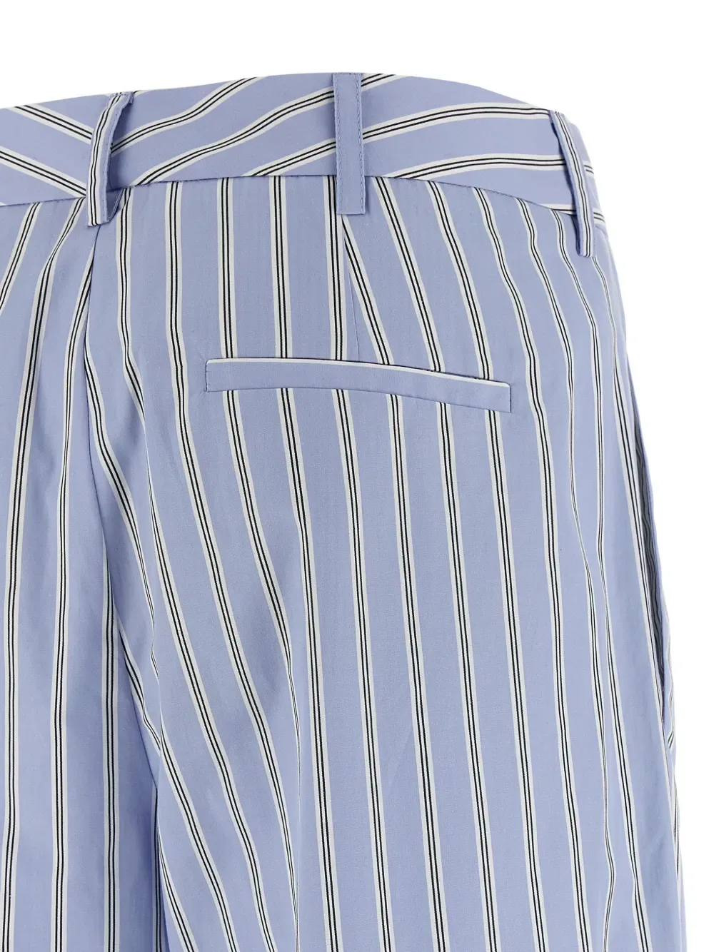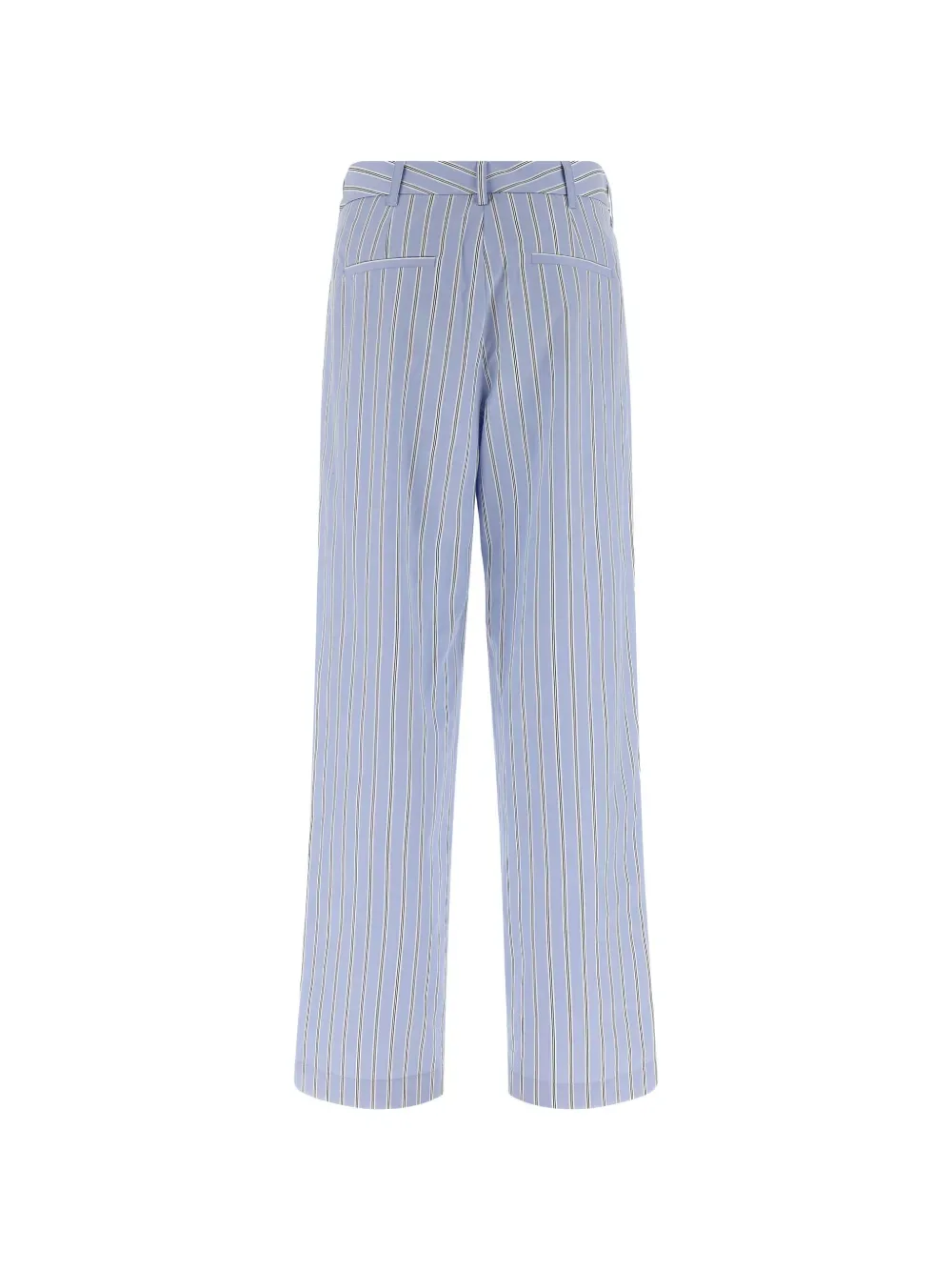 Светло-голубой в полоску, шлевки для ремня, скрытая застежка спереди, два боковых кармана, задние прорезные карманы