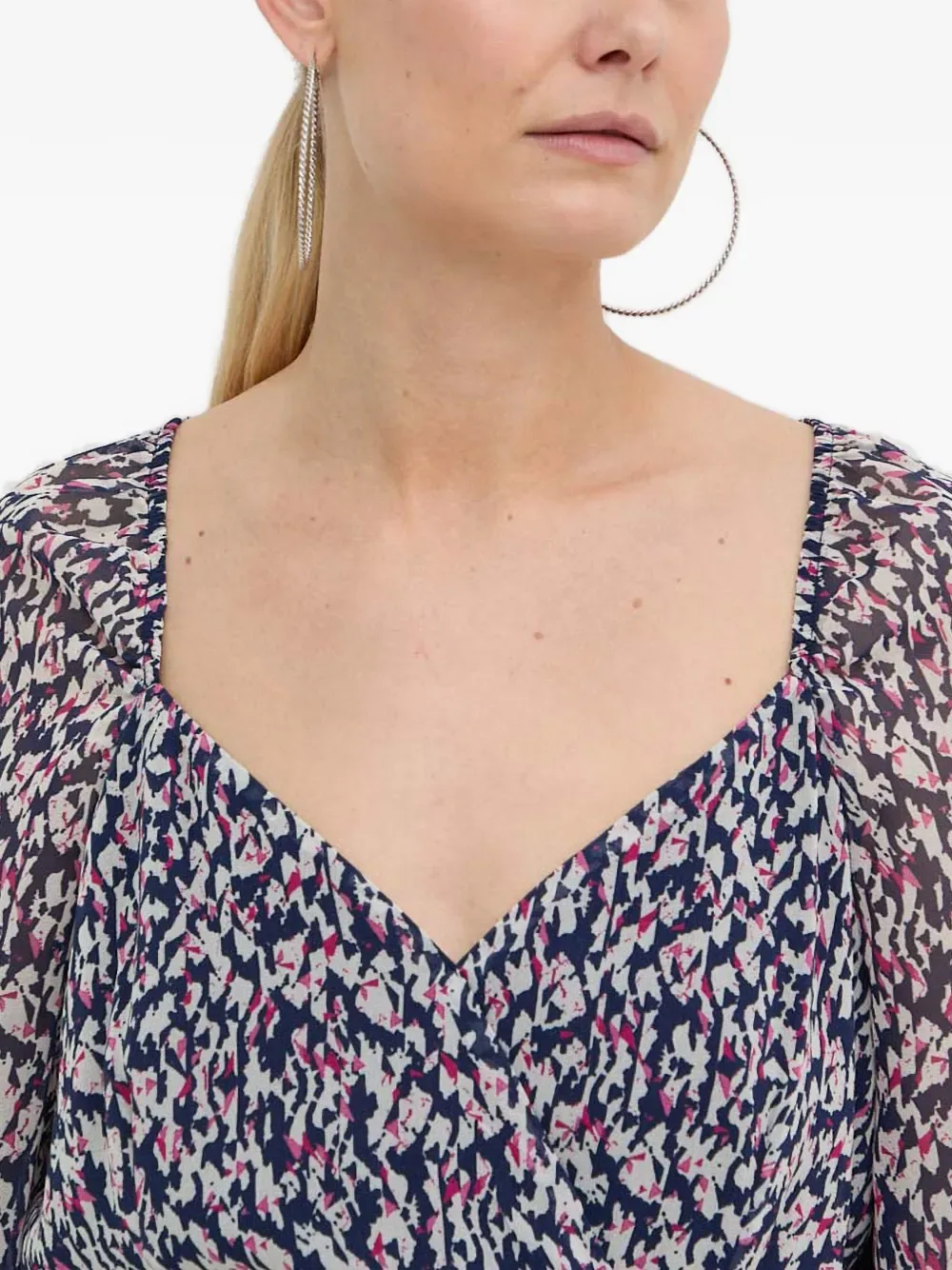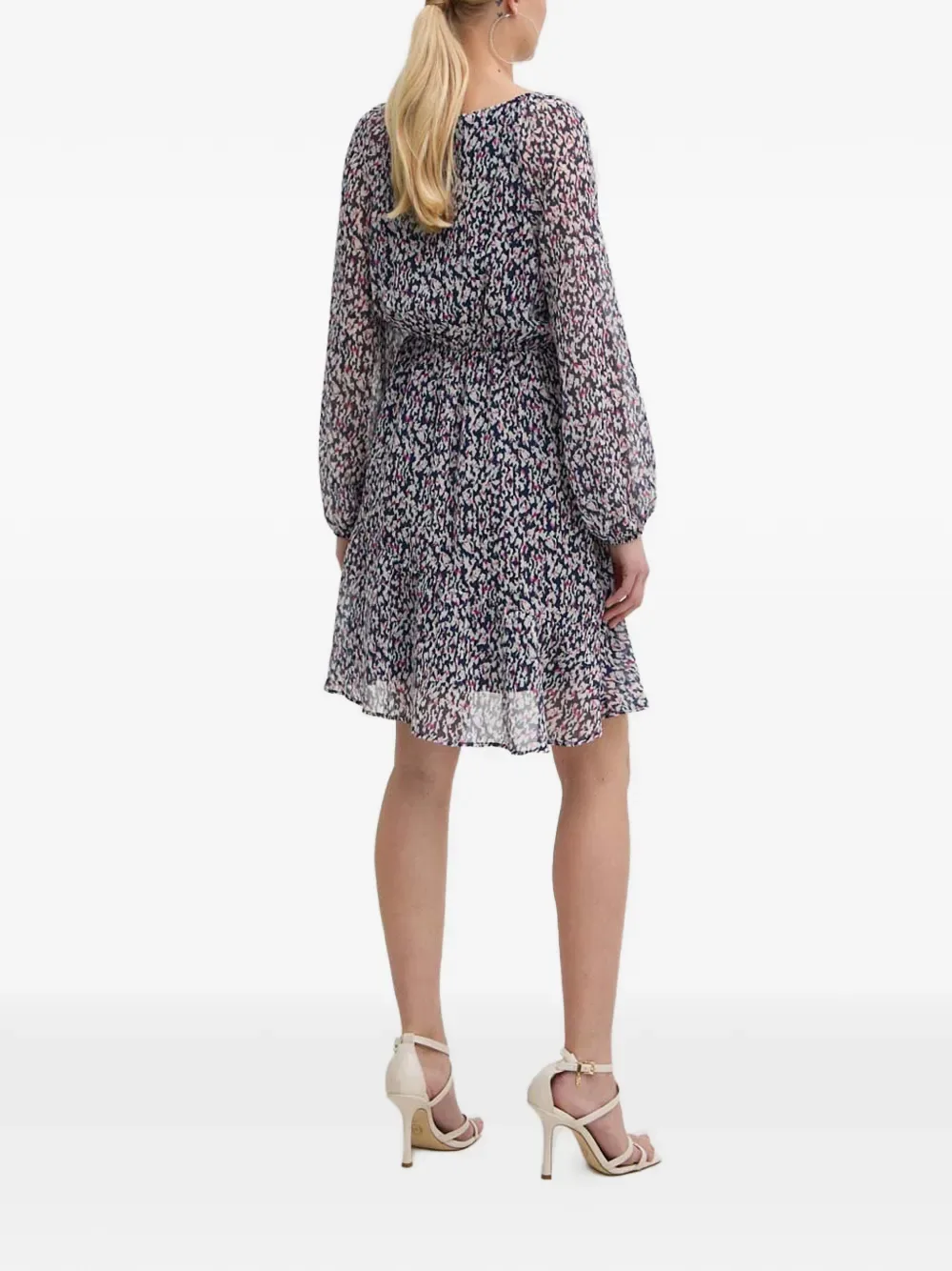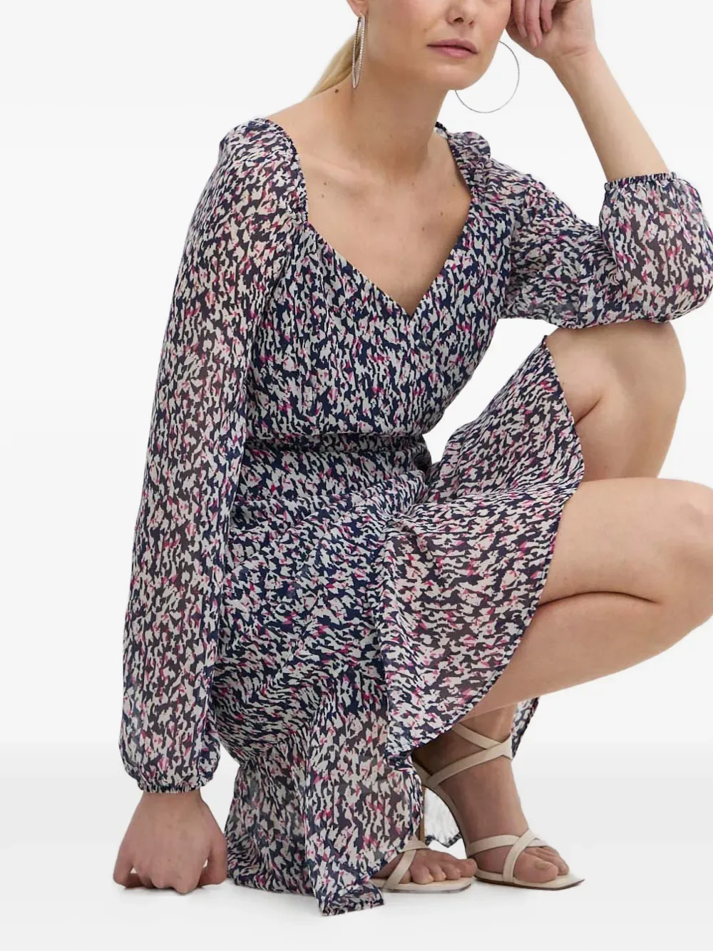 Синее платье с V-образным вырезом, длинными рукавами, эластичной талией и оборчатым подолом