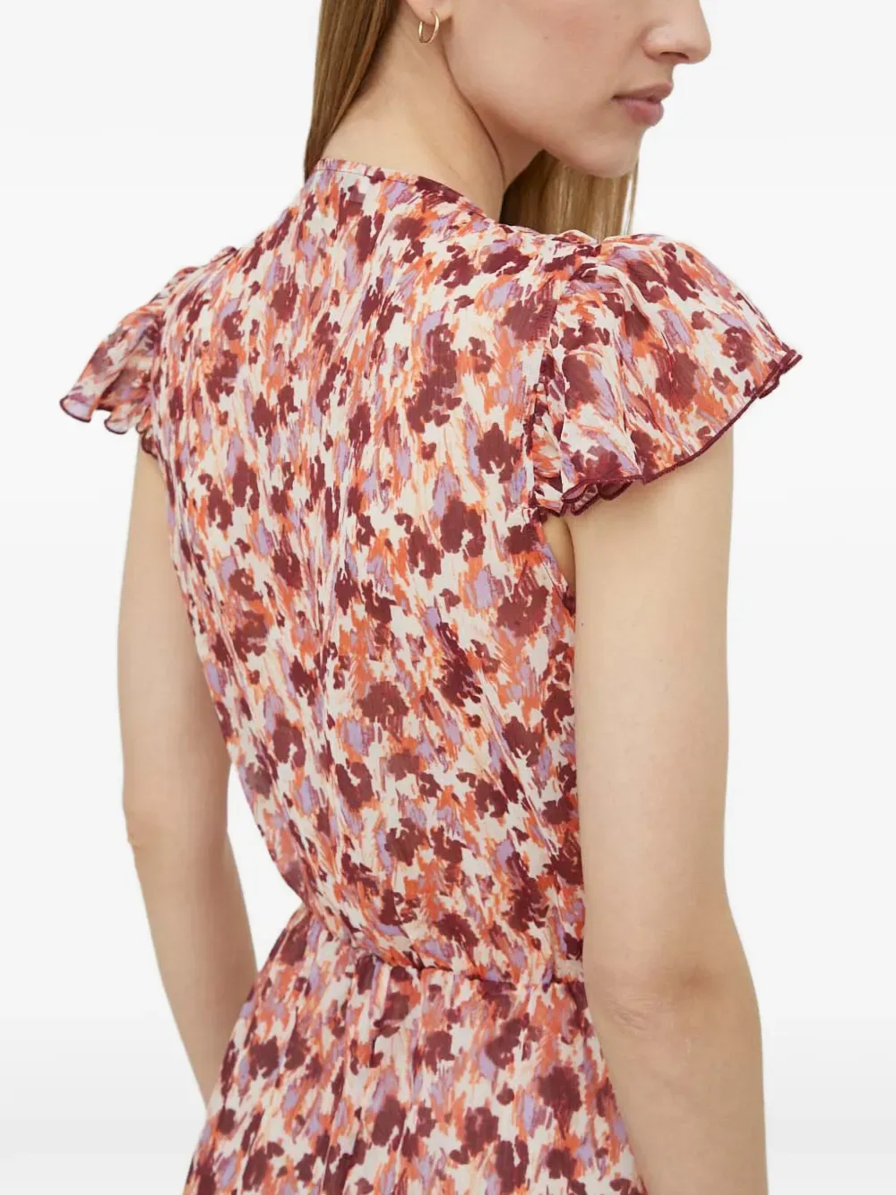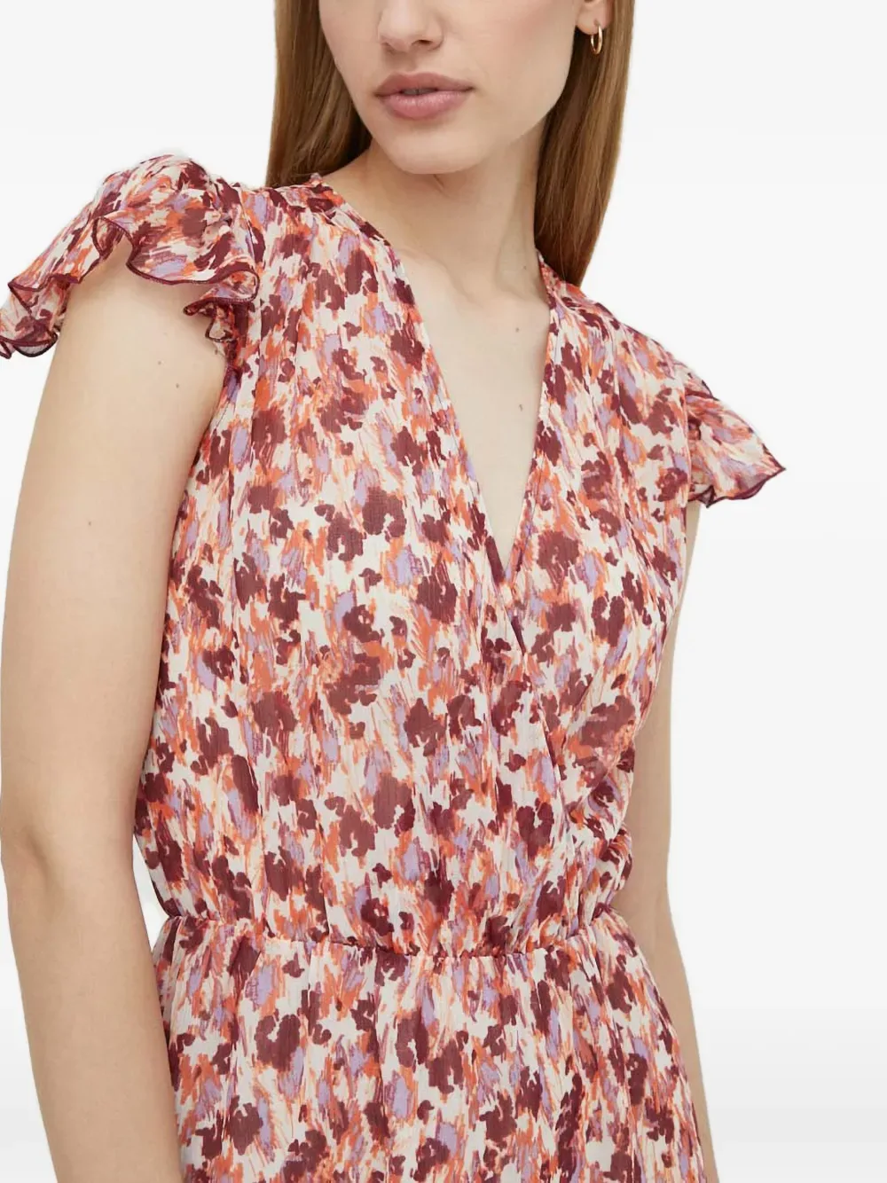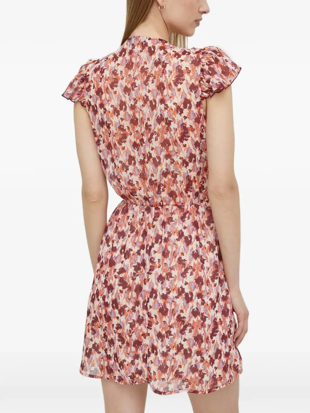 Бежевый и красный V-образный вырез, короткие рукава, отделка рюшами, присборенная талия