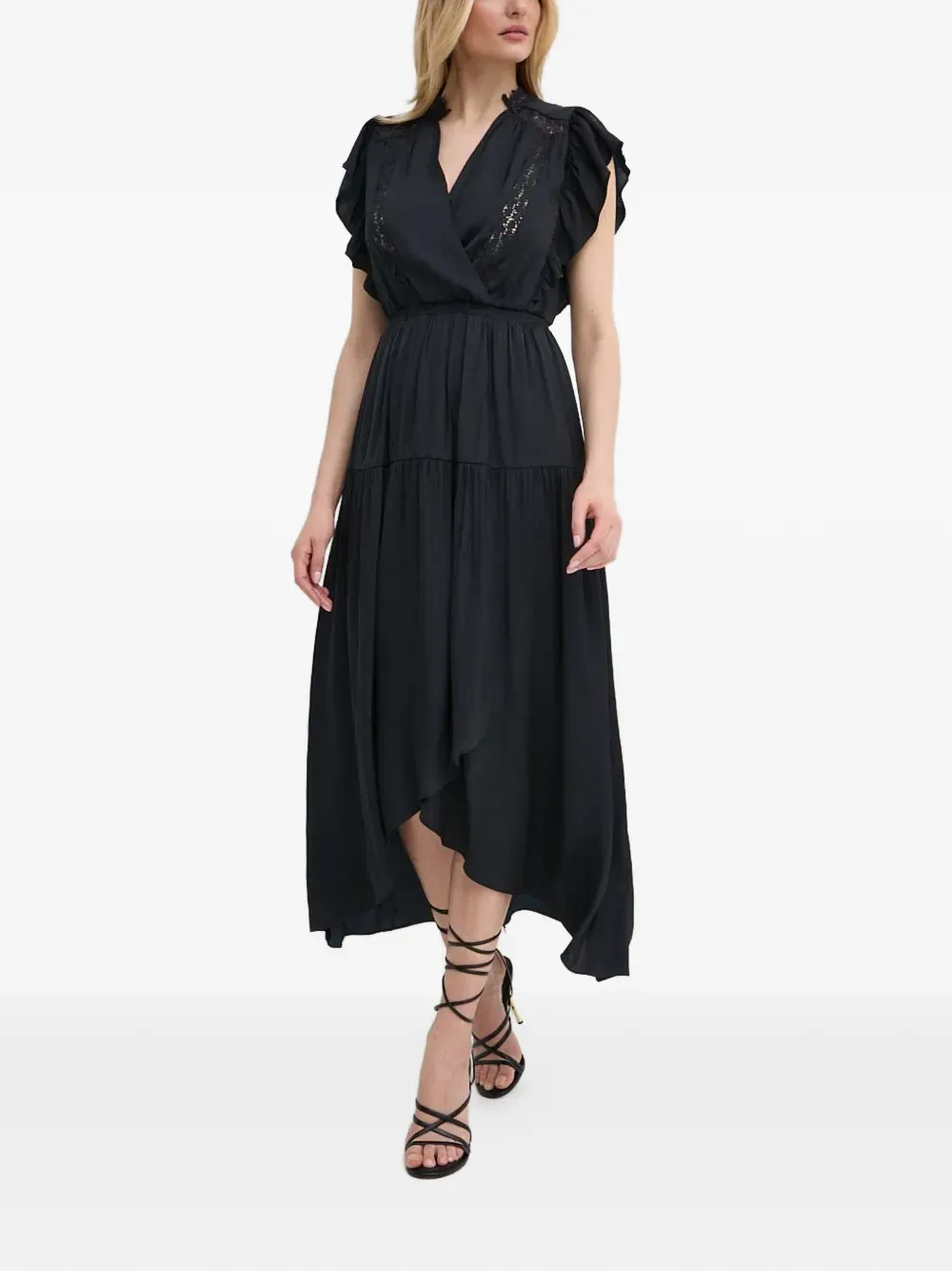 Темно-синее платье с V-образным вырезом, рукавами с рюшами, кружевной отделкой, многоярусной юбкой и асимметричным подолом