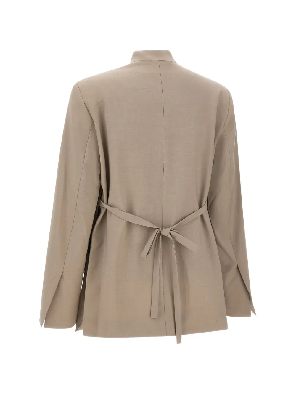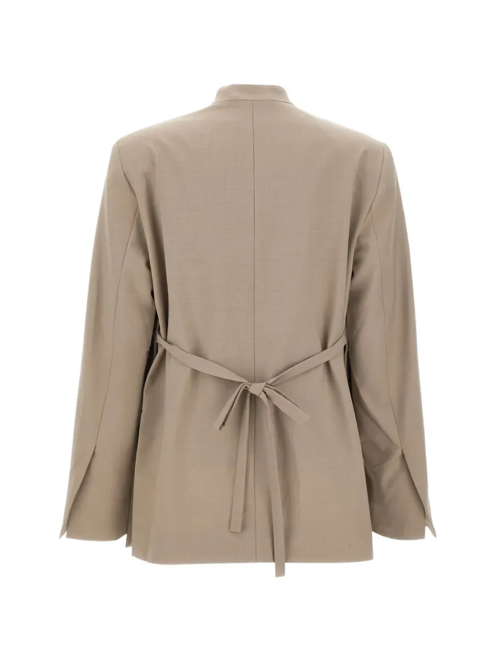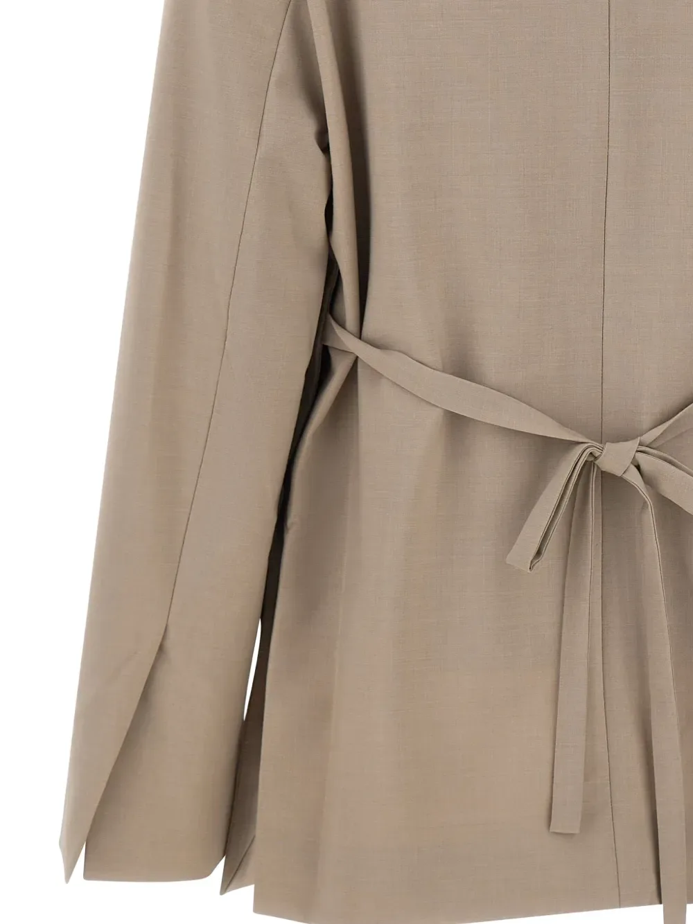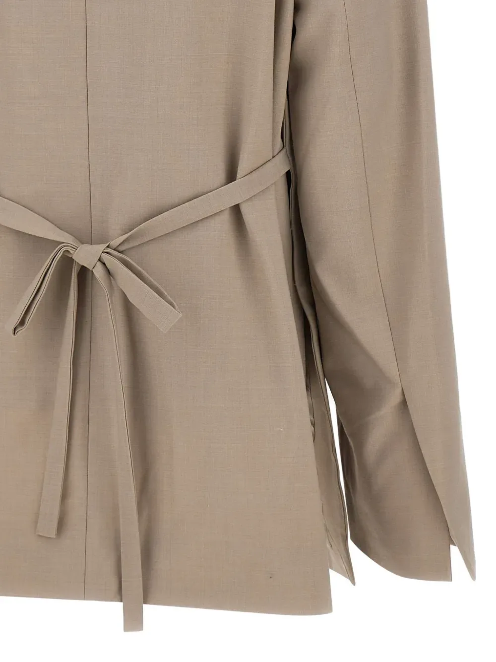 Бежевый цвет, накладные карманы с клапанами, застежка на одну пуговицу, вытачки спереди, боковые шлицы, широкие рукава