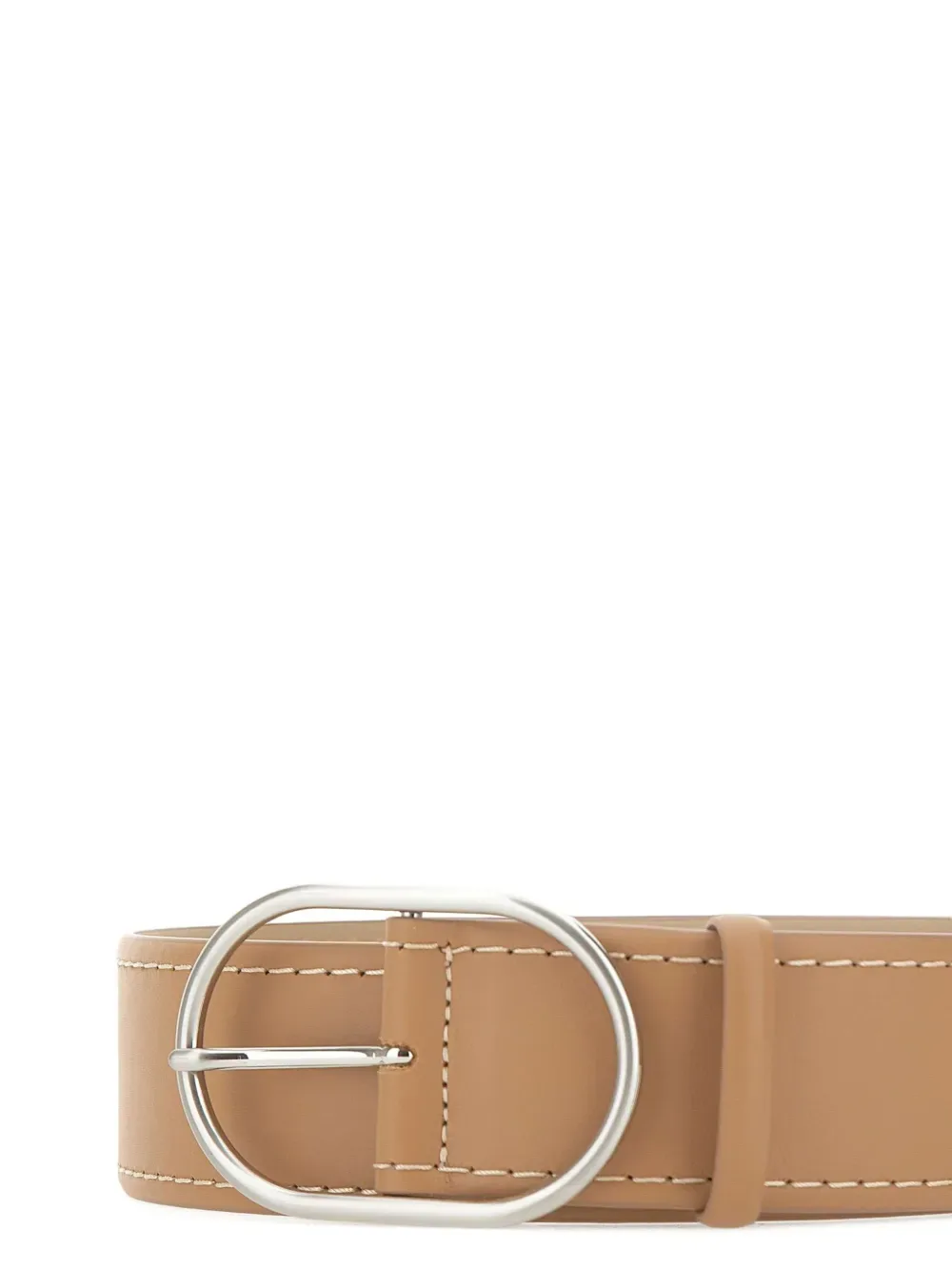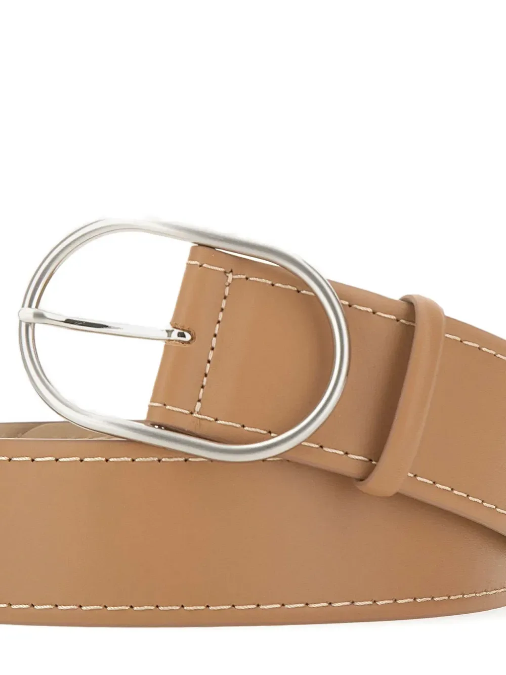 Темно-бежевый кожаный ремень с фурнитурой серебристого оттенка и овальной пряжкой