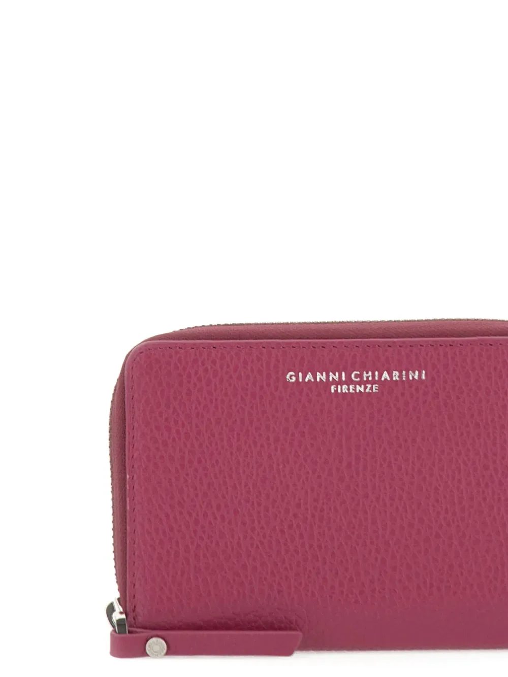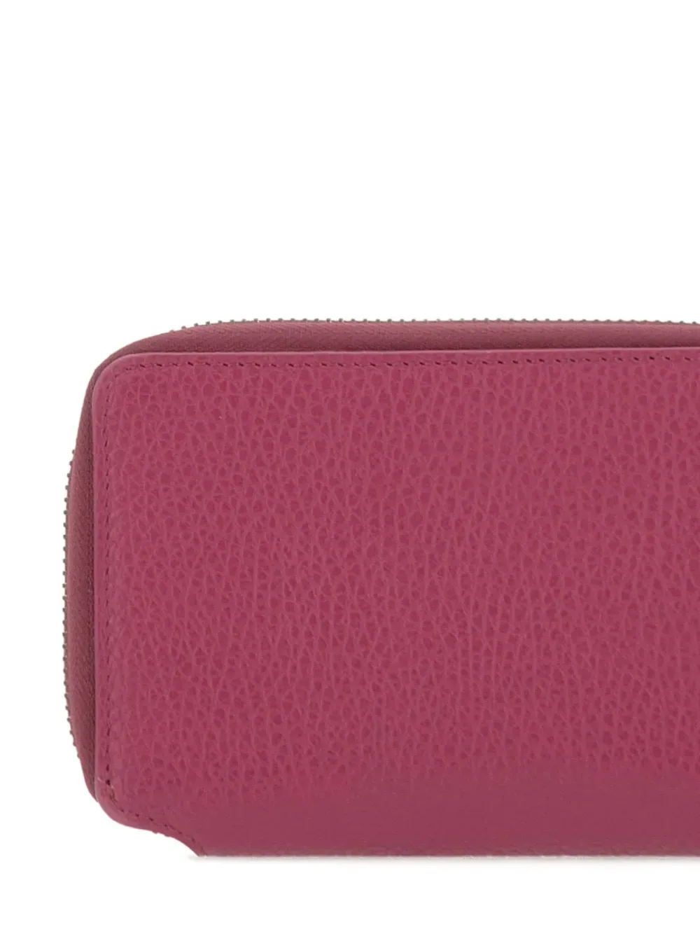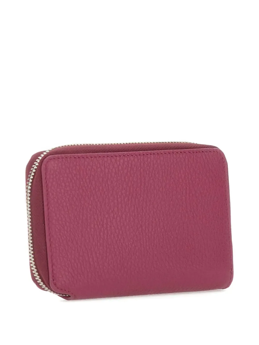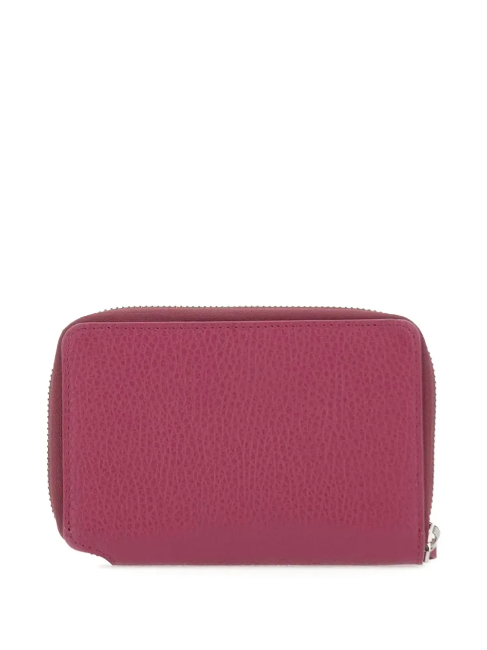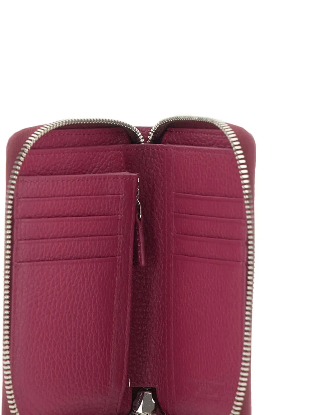 Ярко-розовый цвет фуксии, зернистая фактура, деталь с логотипом, застежка на молнии, несколько слотов для карт, отделение для купюр
