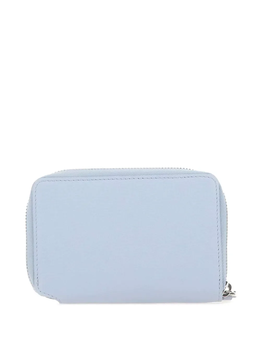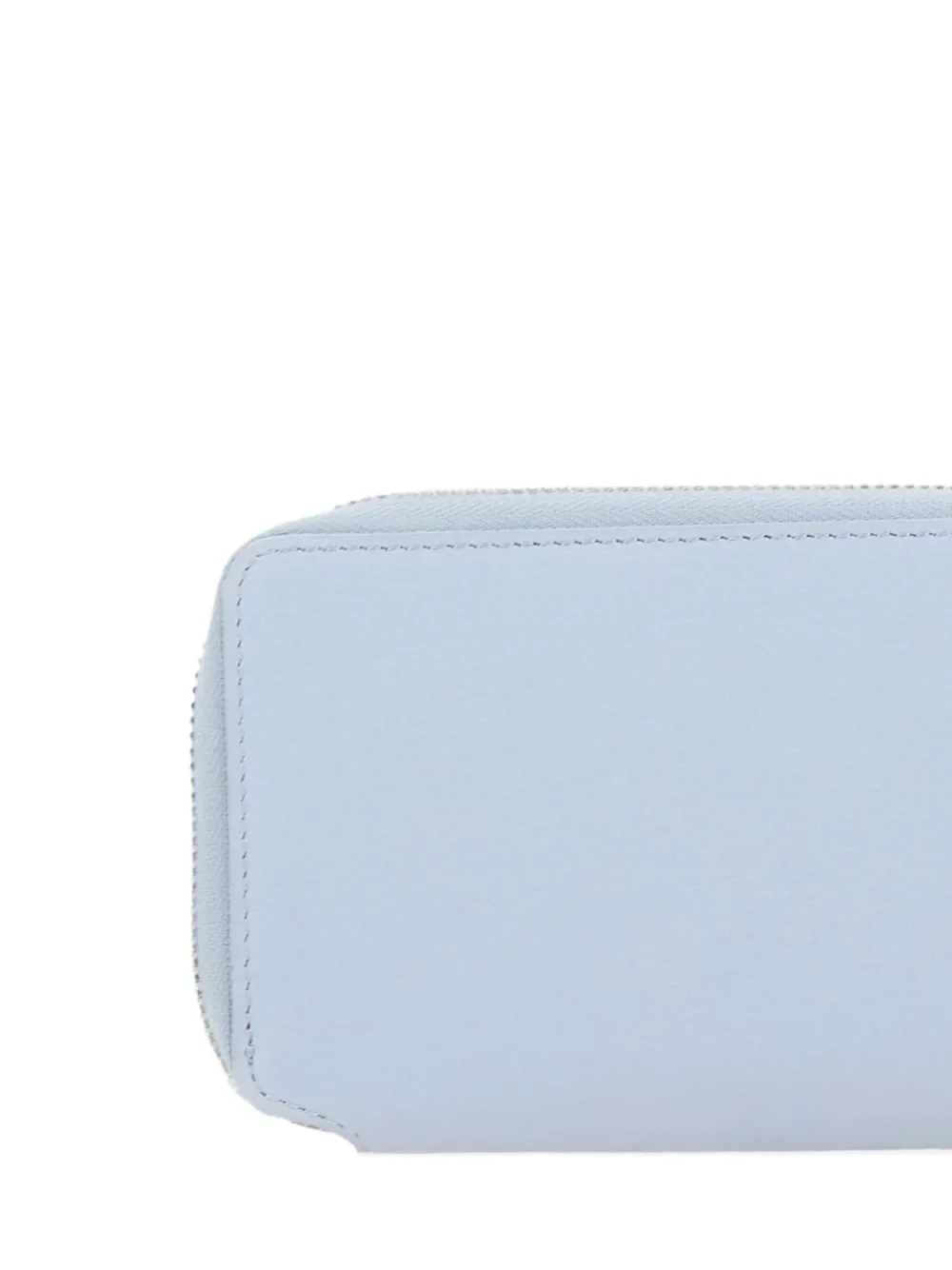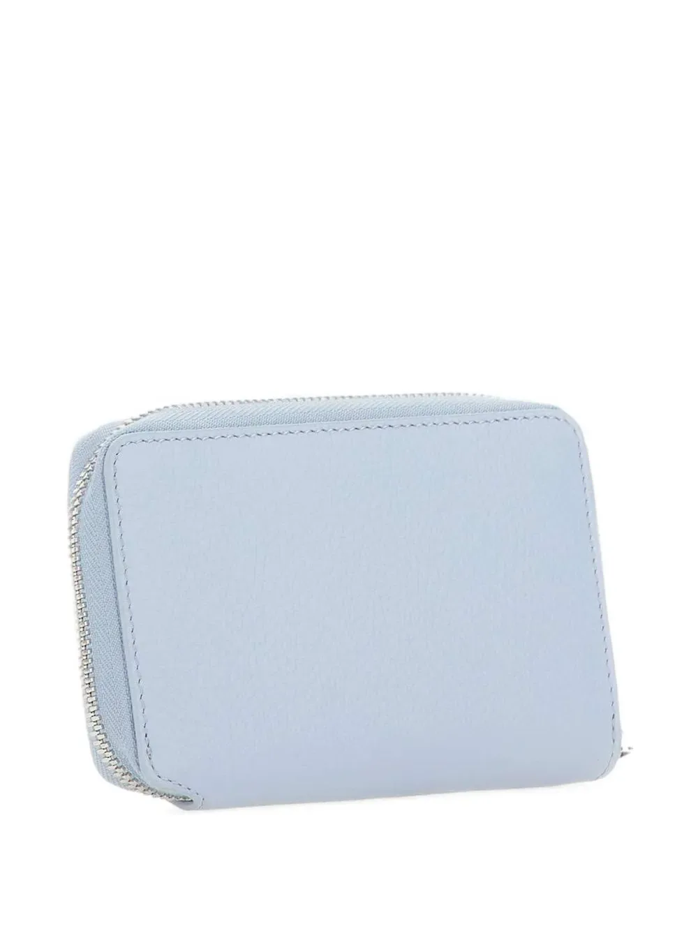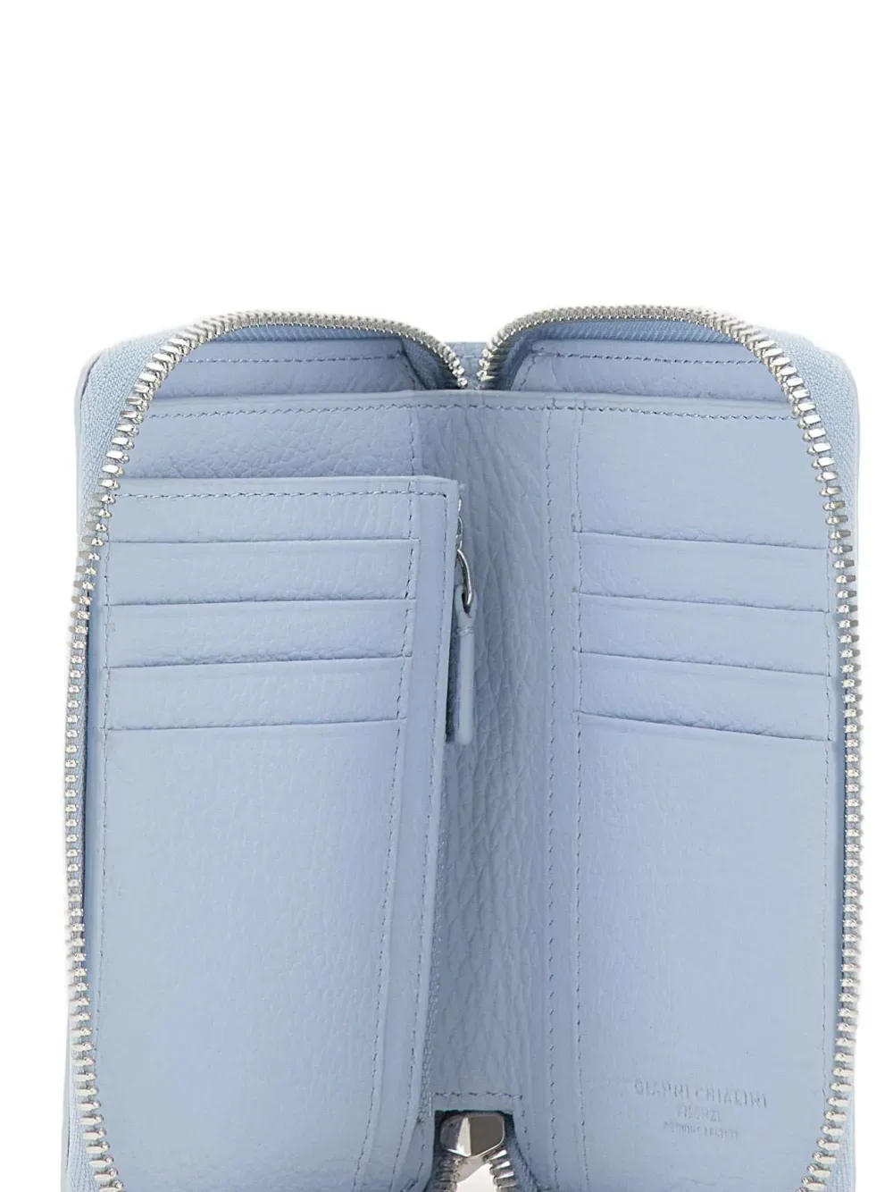 Синий цвет с зернистой текстурой, логотип, застежка-молния, несколько отделений для карт