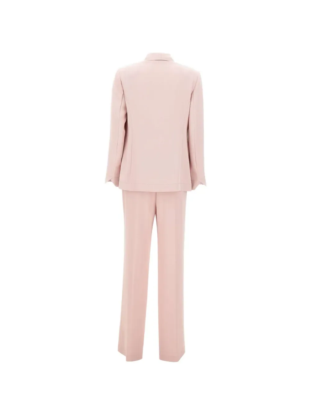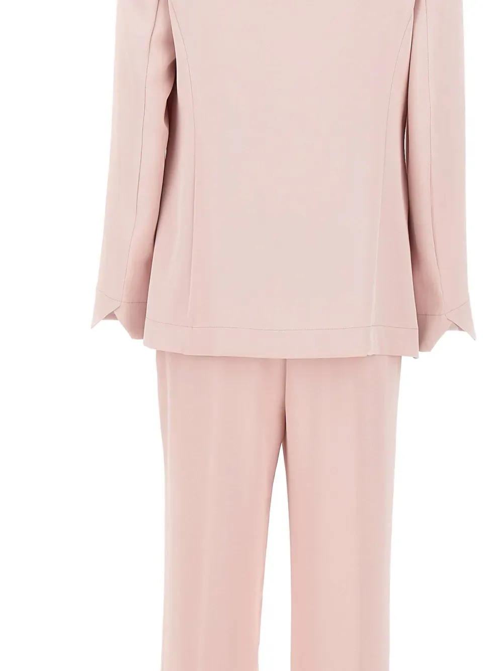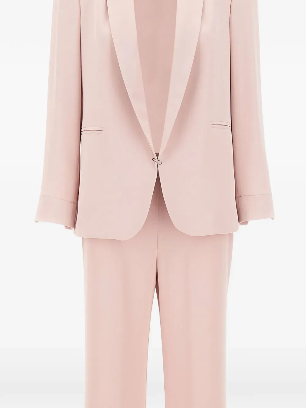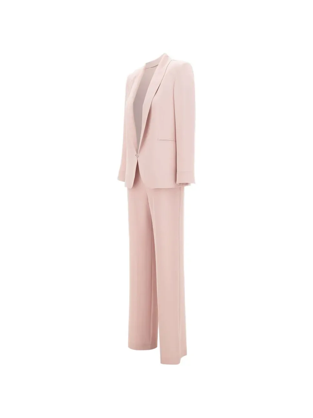 Пастельно-розовый, длинный лацкан, прорезные карманы, скрытая боковая молния, закругленные манжеты, боковые разрезы