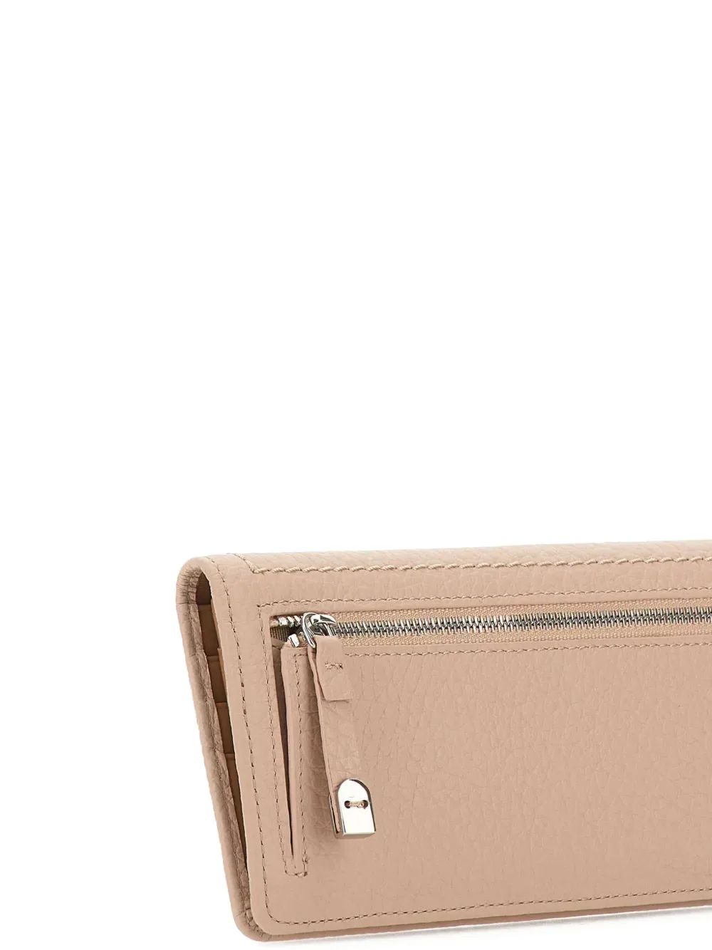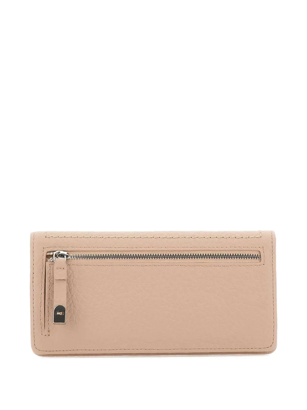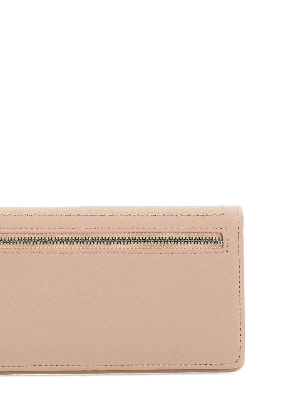 Отделка из зернистой кожи цвета румяного беж; логотип; контрастная строчка; застежка на кнопку; застежка-молния