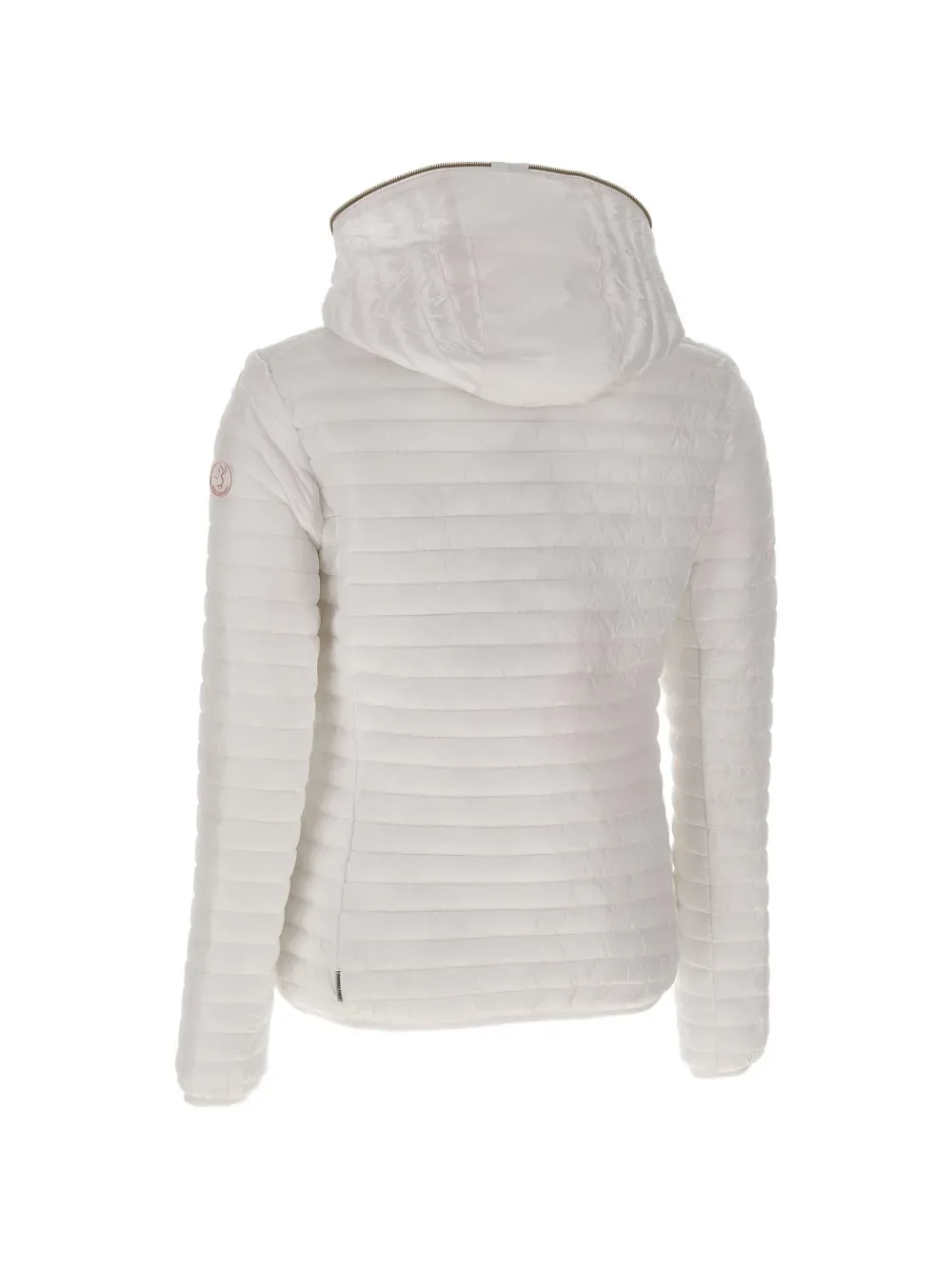 Белая куртка с горизонтальной стежкой, застежка-молния спереди, боковые карманы на молнии, эластичные манжеты, капюшон