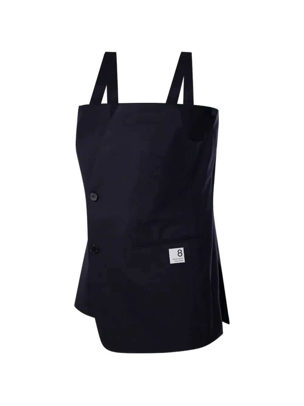 Темно-синий цвет, детали в виде ремешков, застежка на пуговицы, асимметричный подол, карман, нашивка с логотипом