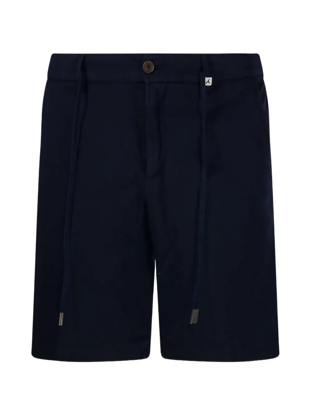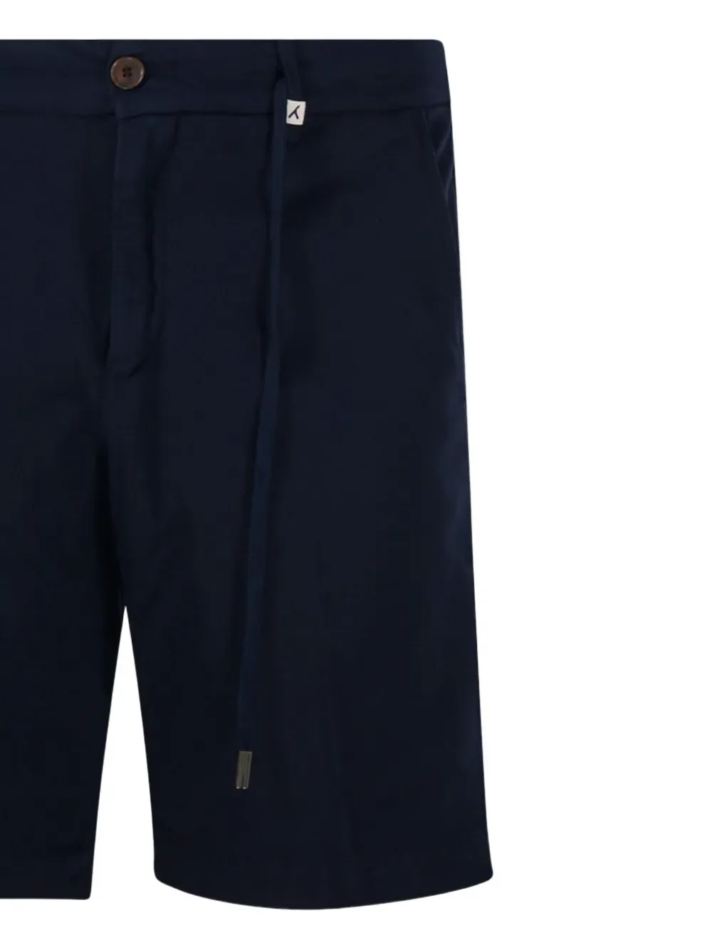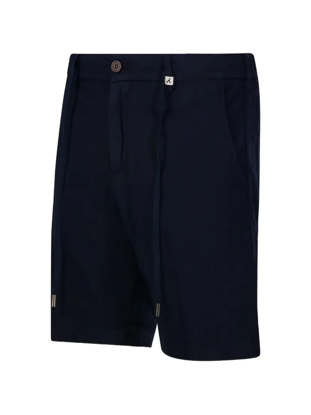 Темно-синий цвет, застегивается на пуговицы, шнурок на спинке, прорезной карман сзади, боковые карманы в шве, эластичный пояс