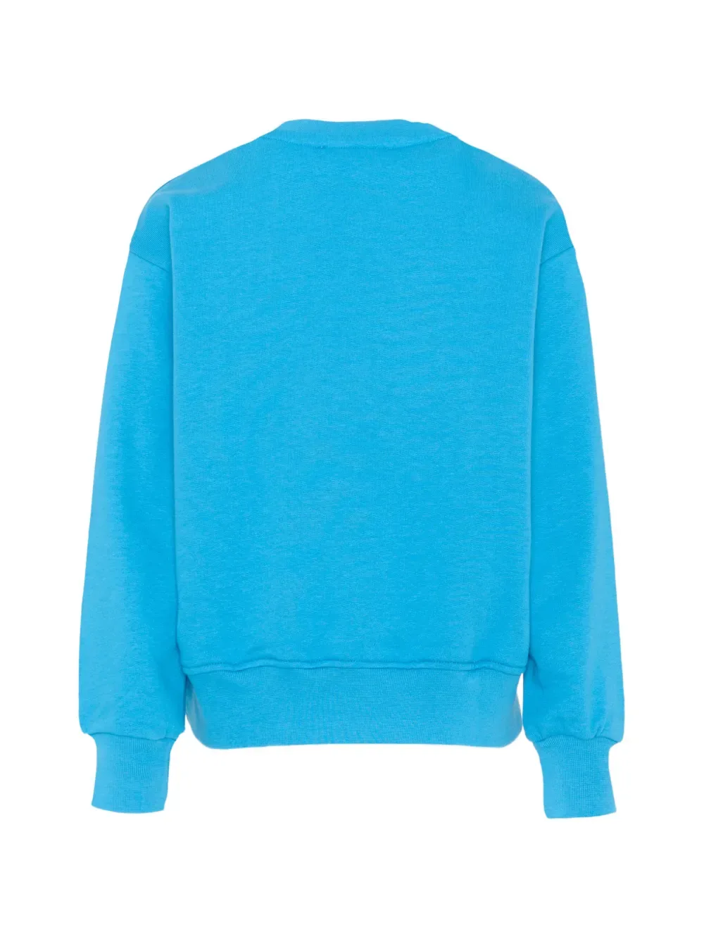 Синий свитшот с принтом-логотипом, кисточками, круглым вырезом, длинными рукавами и ребристыми манжетами