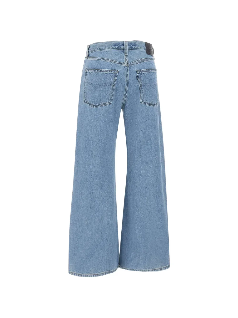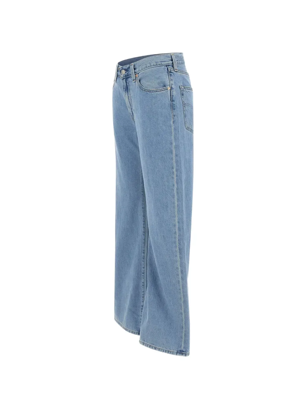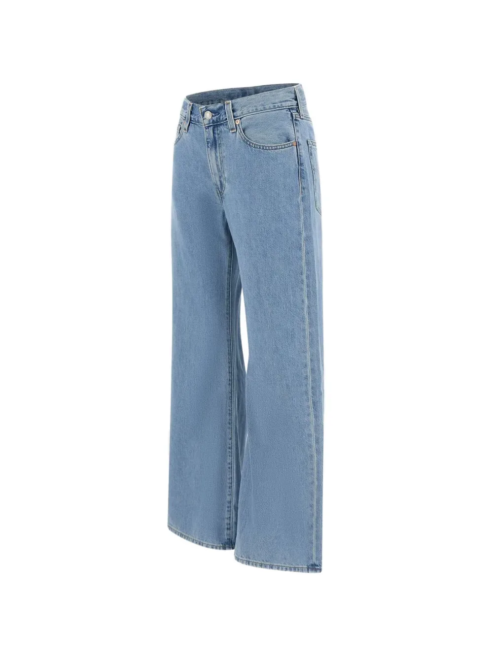 Светло-голубые, пять карманов, застежка на молнию и пуговицу, широкие брючины, изогнутый крой