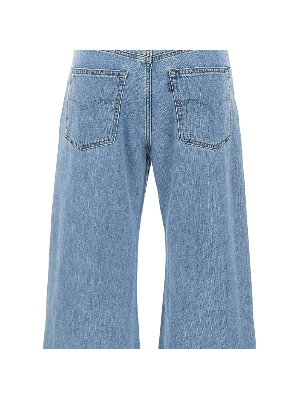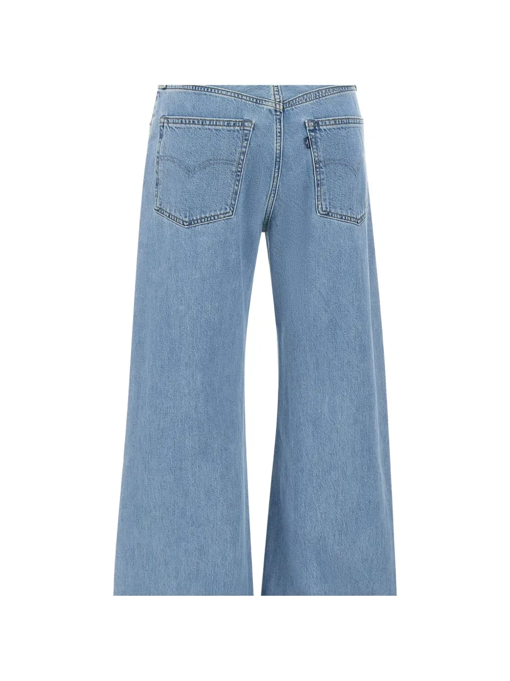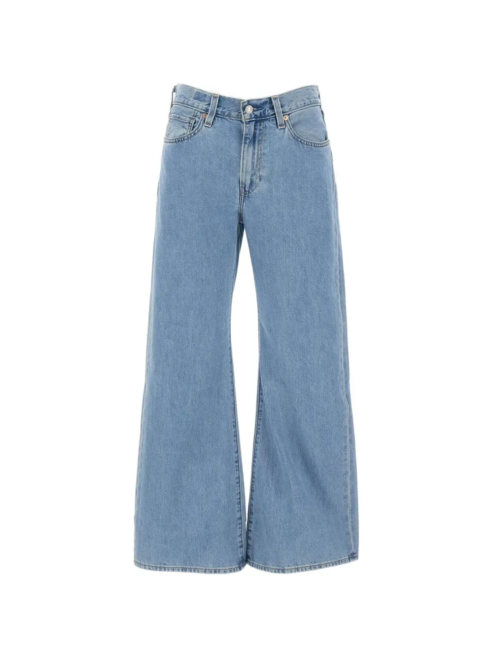 Светло-голубые, пять карманов, застежка на молнию и пуговицу, широкие брючины, изогнутый крой