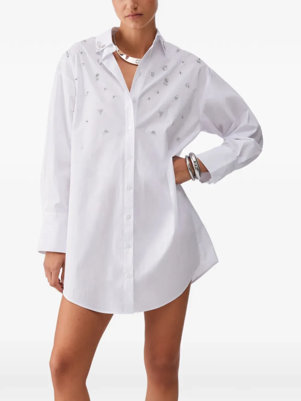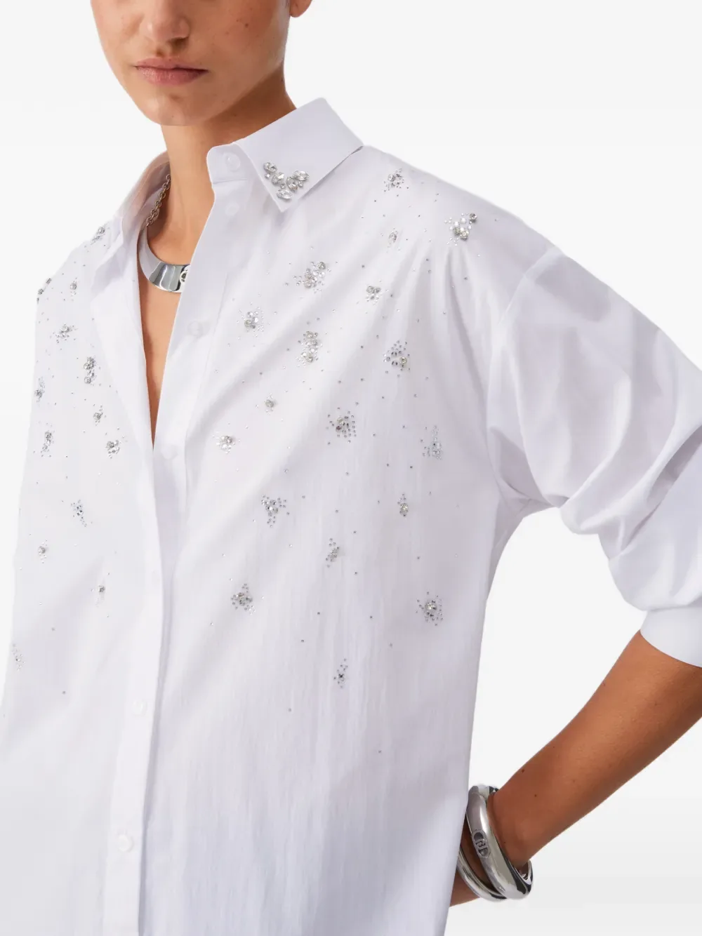 Белая рубашка с украшением из драгоценных камней, застежка на пуговицы спереди, стиль рубашки, поплиновая отделка, длинные рукава