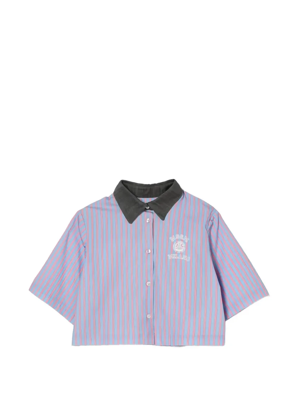 Светло-голубая рубашка в полоску с воротником, логотипом, короткими рукавами и застежкой на пуговицы